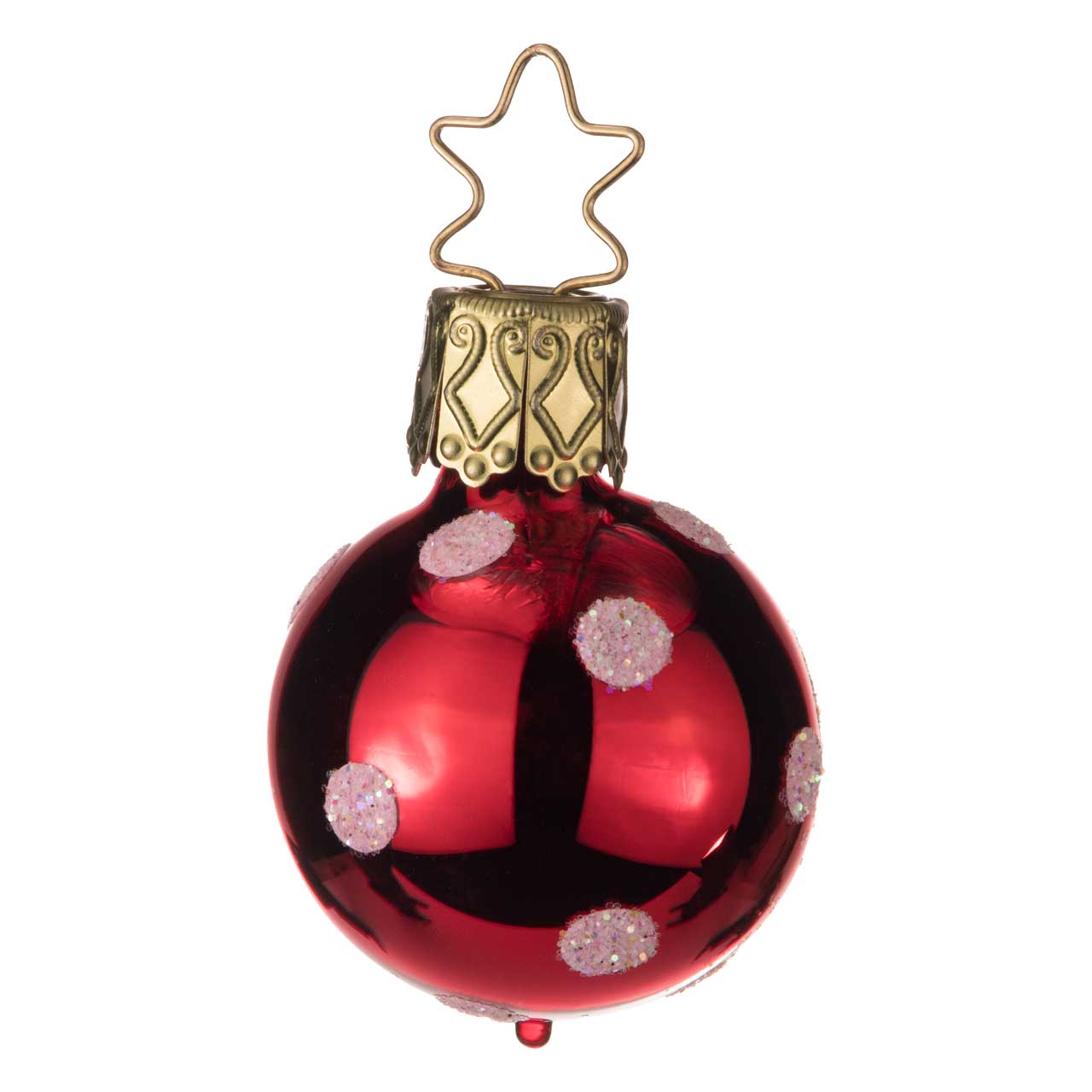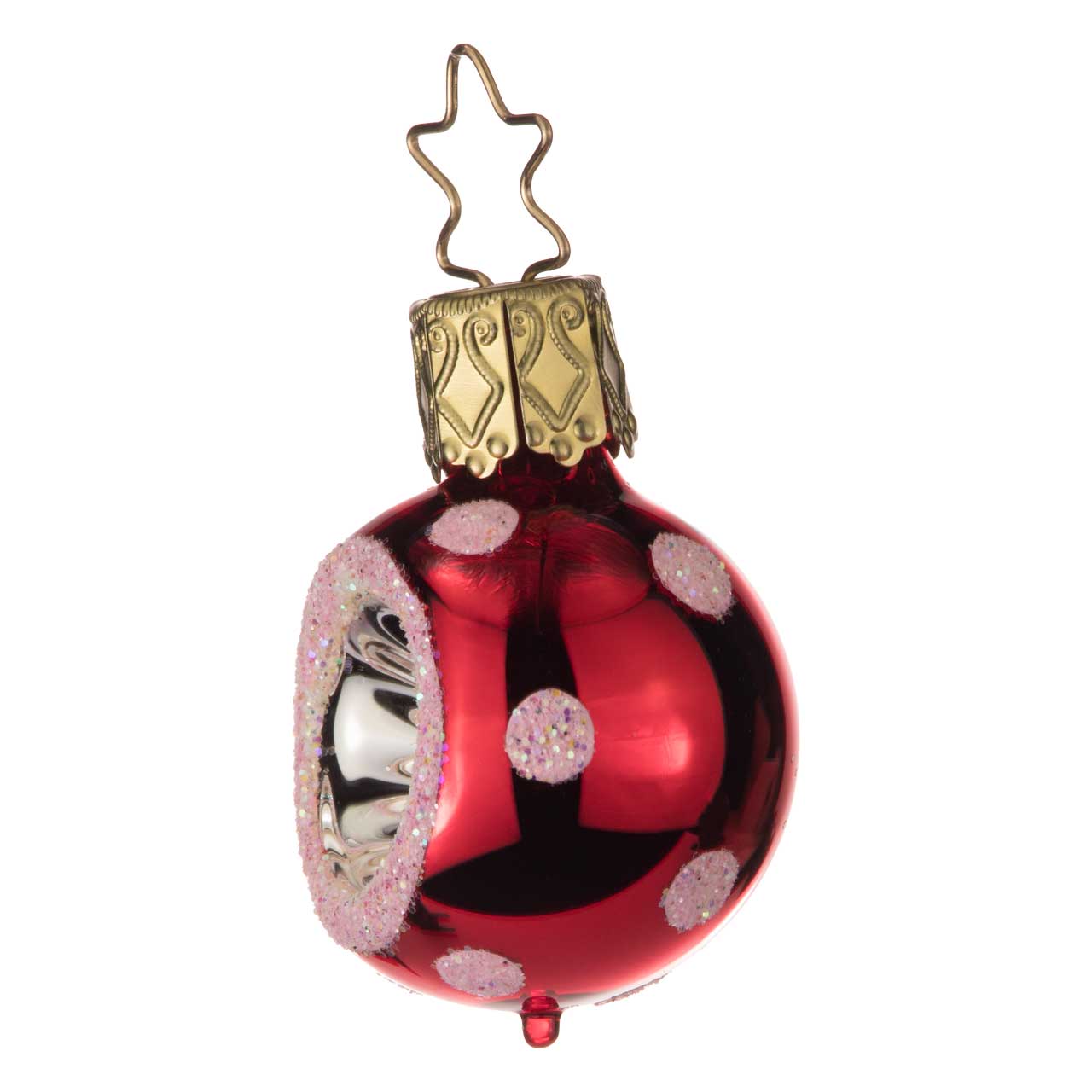 This small reflective ball is spherical in shape and comes in shiny red. It is decorated with delicate pink glitter dots for a playful effect. The indentation on the front is framed with sparkling glitter and features a radiant golden reflective flower on the inside, which catches and reflects the light beautifully. A detailed, elegant accent in miniature format.