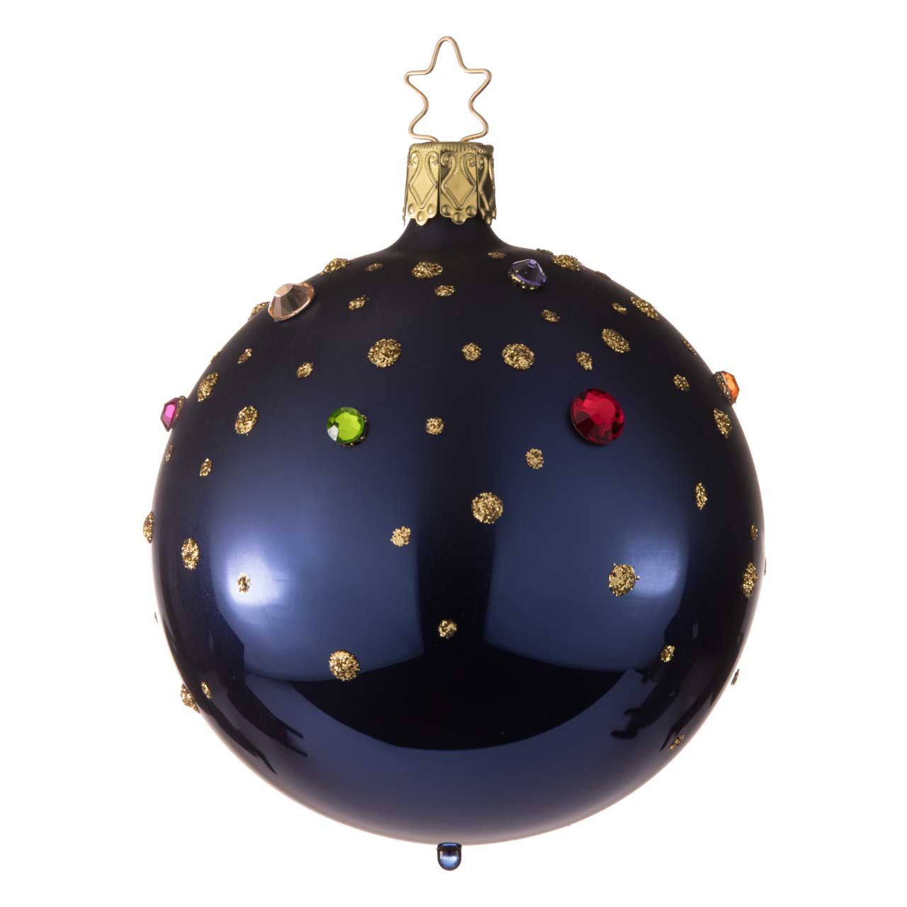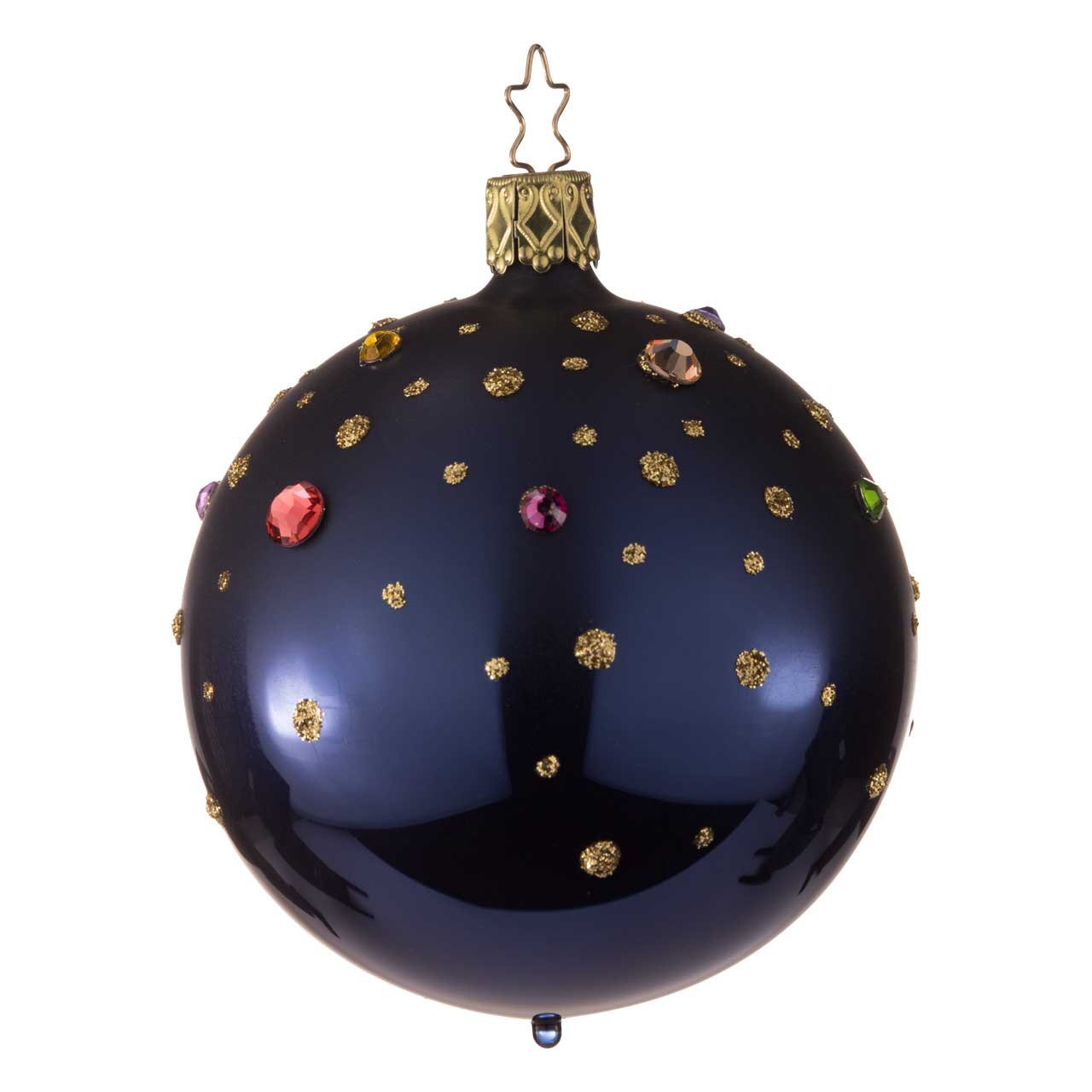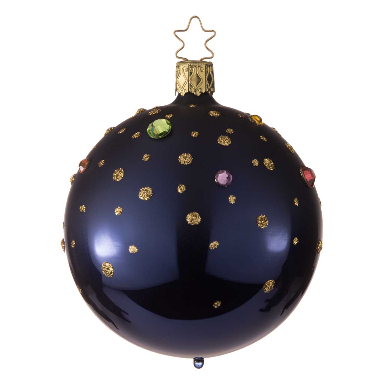 The ball has a classic round shape and is a deep, elegant midnight blue. Golden dots are reminiscent of stars, while incorporated colored gemstones in red, green and purple provide additional sparkling accents. The figurine looks elegant and mysterious and adds a touch of starry magic to any decoration.