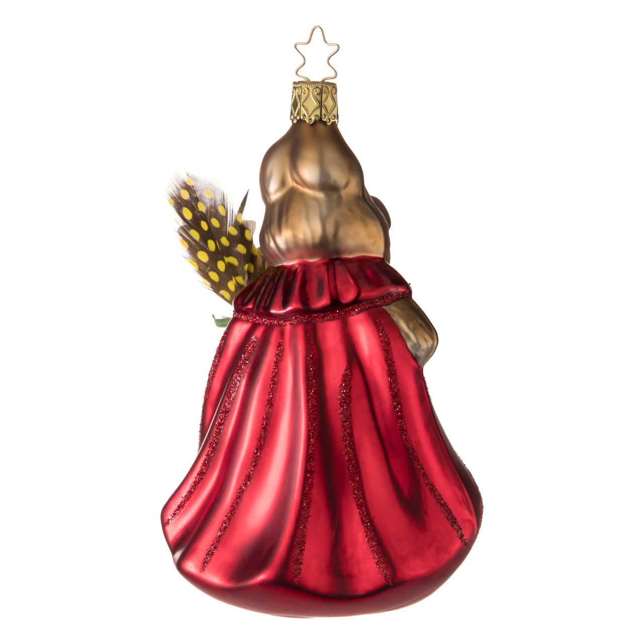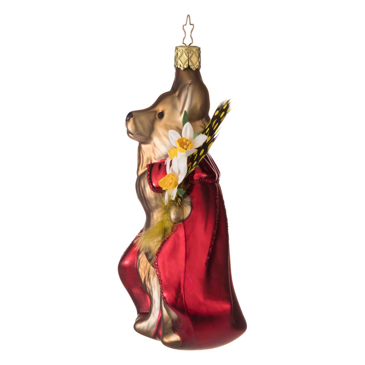 The figure shows the wolf standing upright, dressed in a striking red cloak with glittering accents and a warm golden-brown coat. He holds a small bouquet of flowers in his paw, creating a playful contrast. The shape is sculpted and detailed, with a combination of shiny red, gold and natural hues.