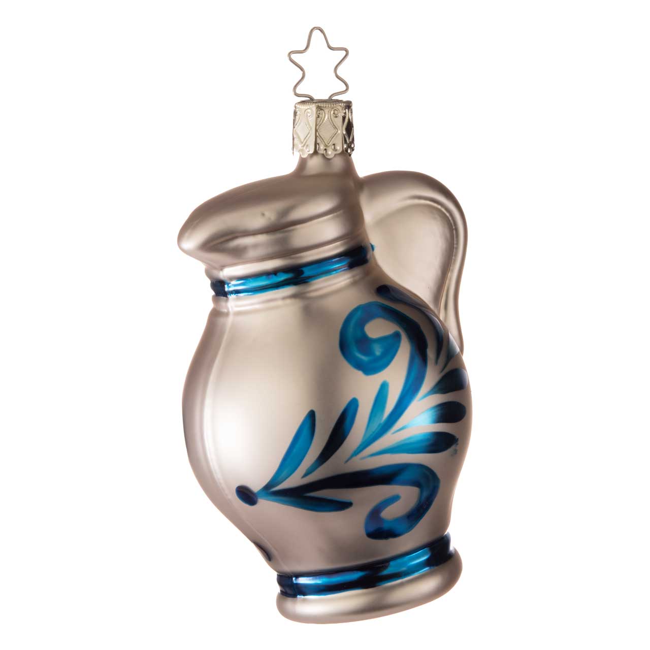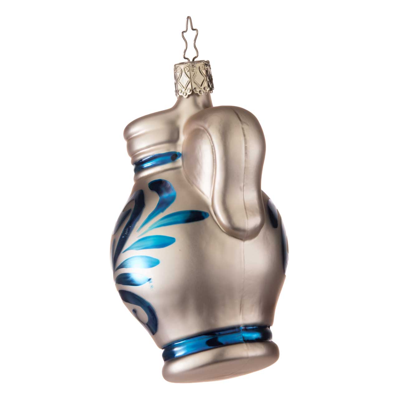 This figurine faithfully reproduces the characteristic shape of the Bembel with its curved handle and bulbous body. In matt gray and decorated with bright blue ornaments, it looks both traditional and stylish. The harmonious color scheme and distinctive jug shape make this ball a charming eye-catcher with regional flair.