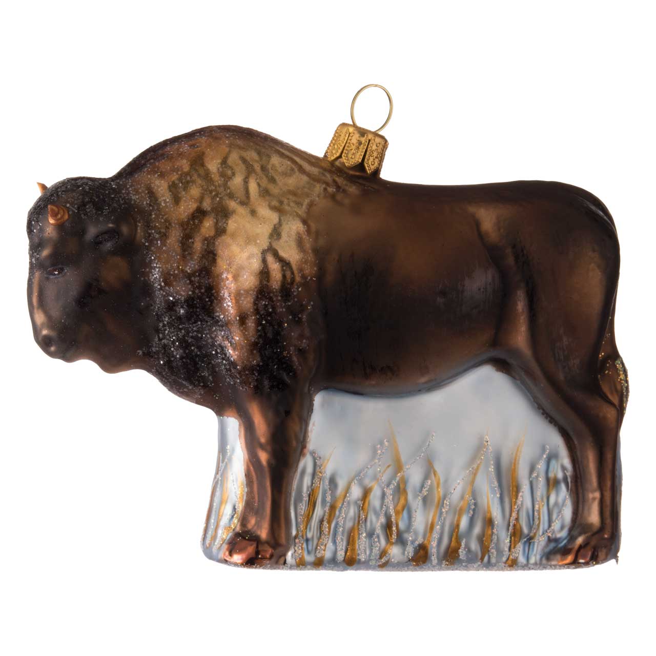 This detailed figurine shows the proud bison in warm brown and black tones with slightly shimmering fur. The mighty shoulders and shaggy neck are finely sculpted and have a touch of glitter to emphasize the texture of the fur. The soft gray and gold background is reminiscent of frozen grass in the winter light