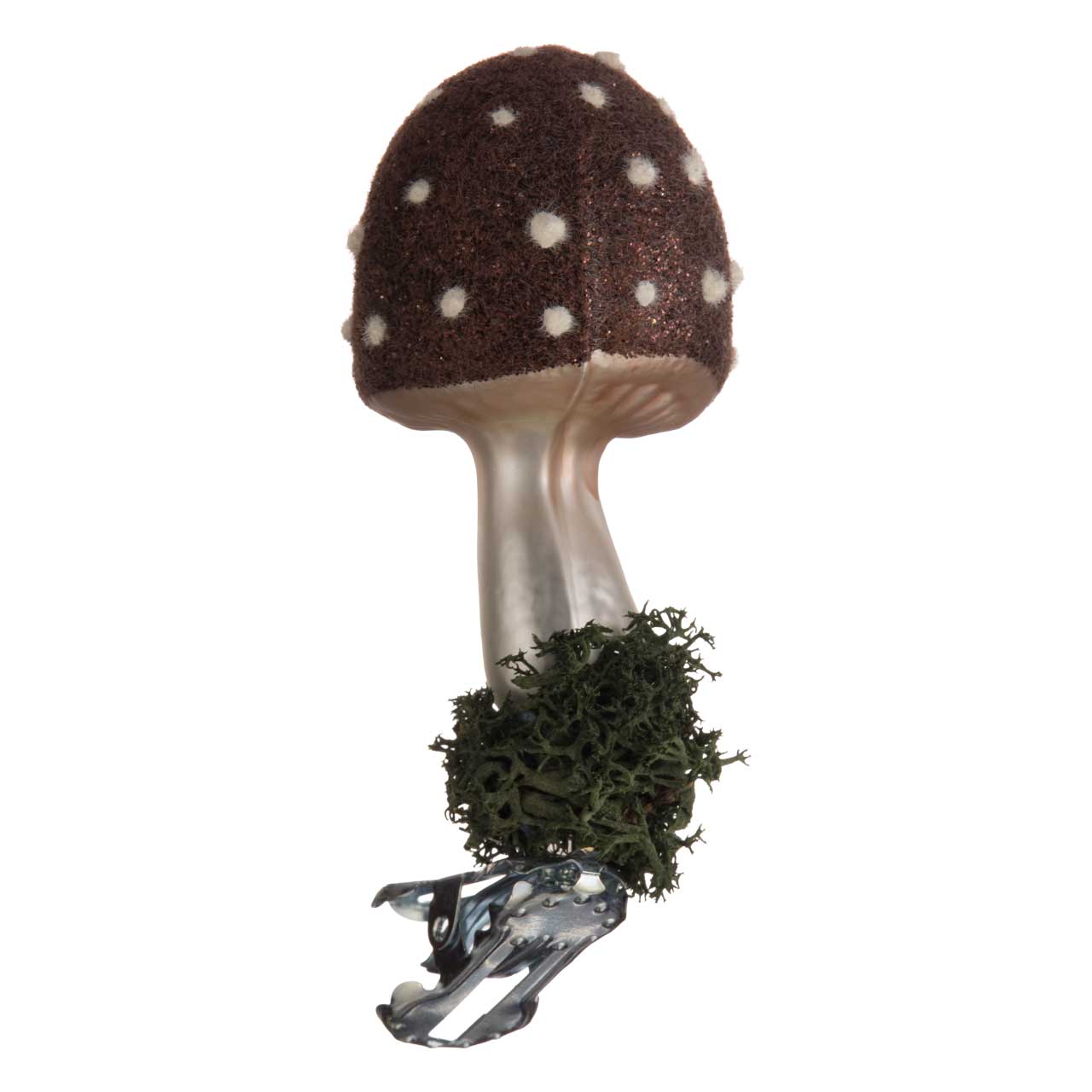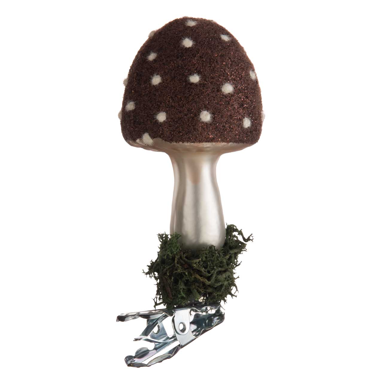 This version features a brown fly agaric with a finely textured surface, white dots and a silky, shimmering stem. The base is decorated with real moss, giving the design a natural, authentic character. The combination of matt brown, warm pearly white and delicate glitter creates a harmonious, earthy elegance.