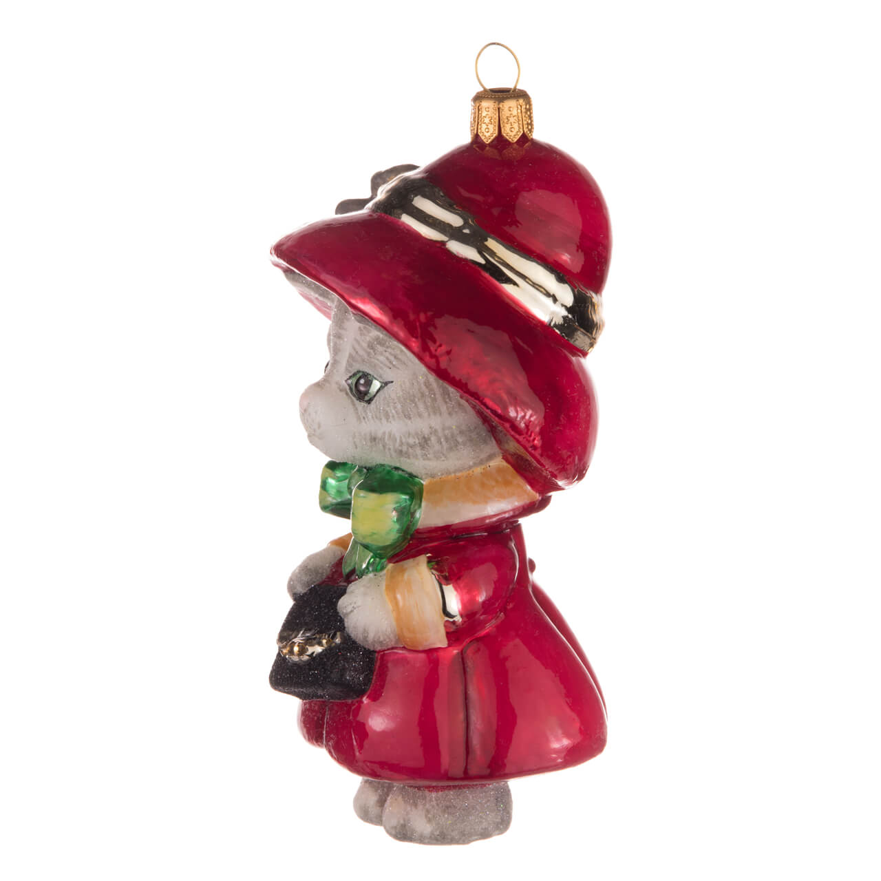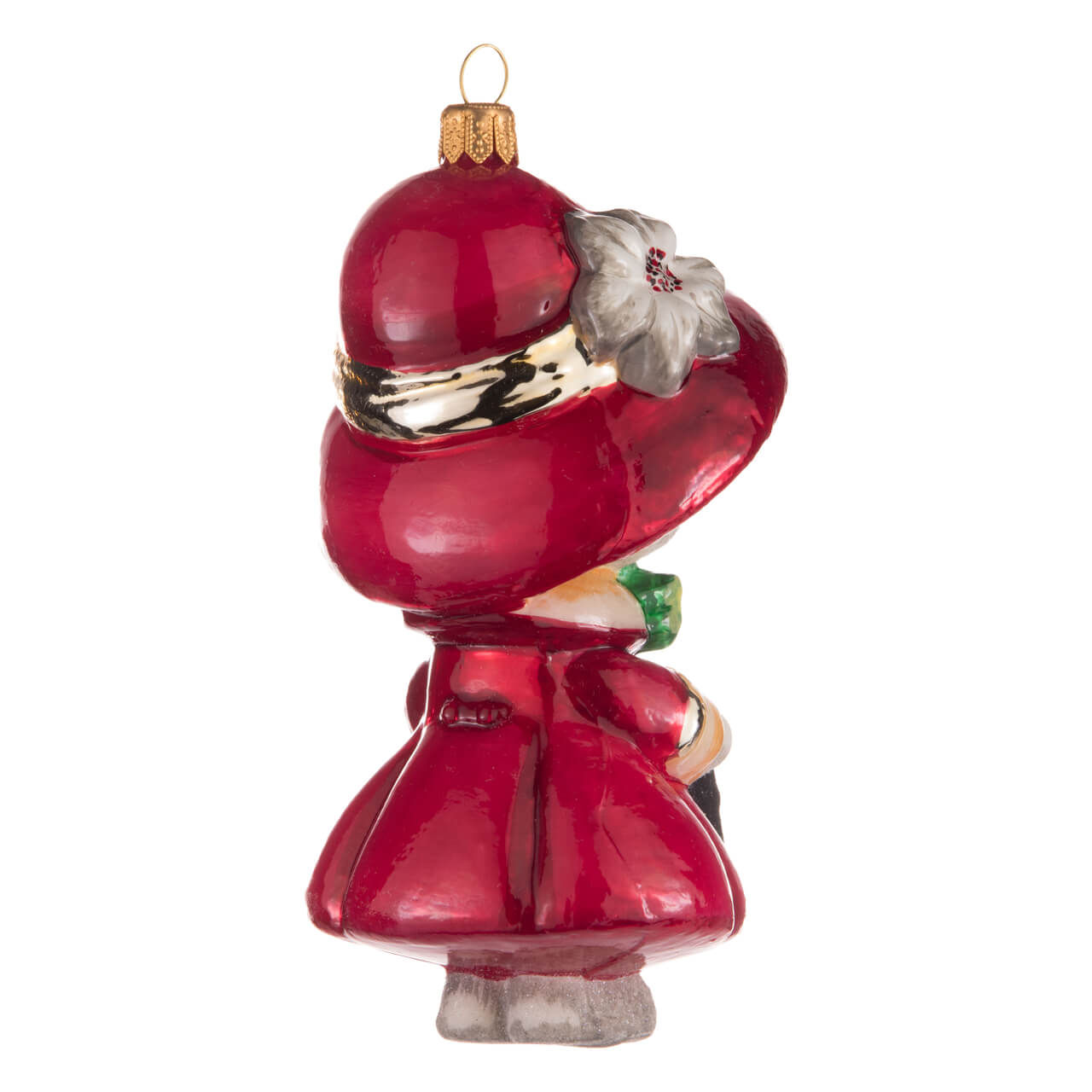Like a young lady: a red dress with a wide swinging skirt, peach-colored collar and cuffs, a magnificent XXL bow around her neck and a gorgeous red hat on her head with a gray and white flower and golden band that would have made both of them proud - Little Red Riding Hood or the Queen. Yes, this creature definitely knows how to dress up.