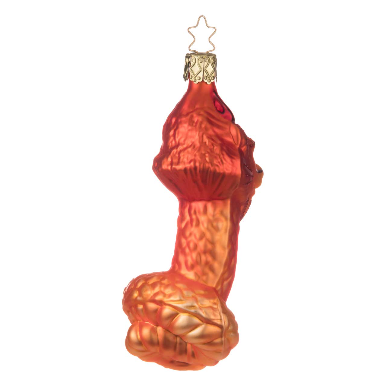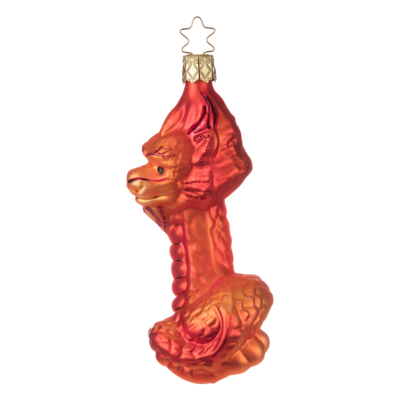 The figurine shows a curved dragon's body in vibrant red-orange with golden accents. The dragon has a detailed face with striking contours and glittering decorations that emphasize its mystical expression. The shape is elongated and slightly curved, creating the impression of movement and liveliness. A luminous highlight with an intense color effect.