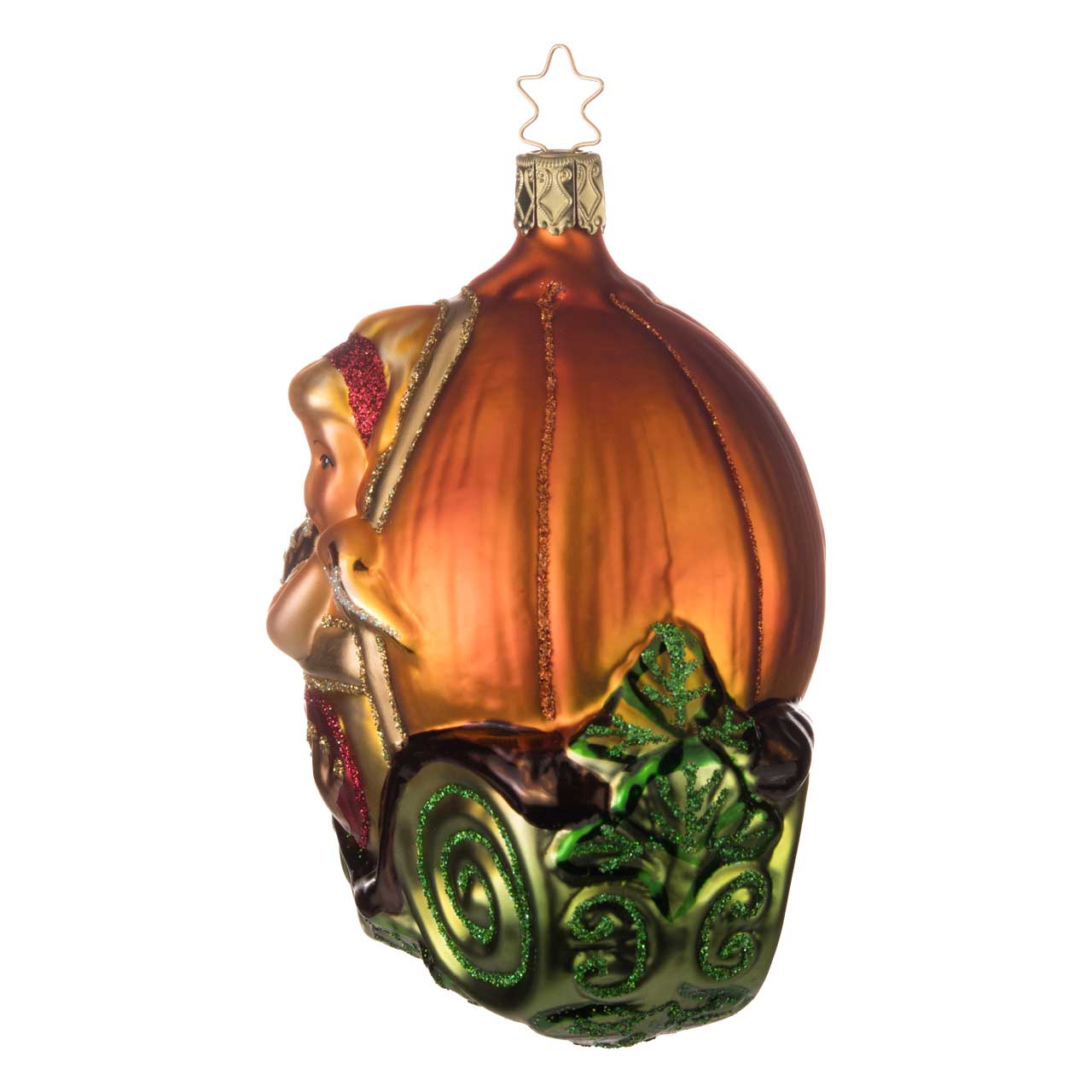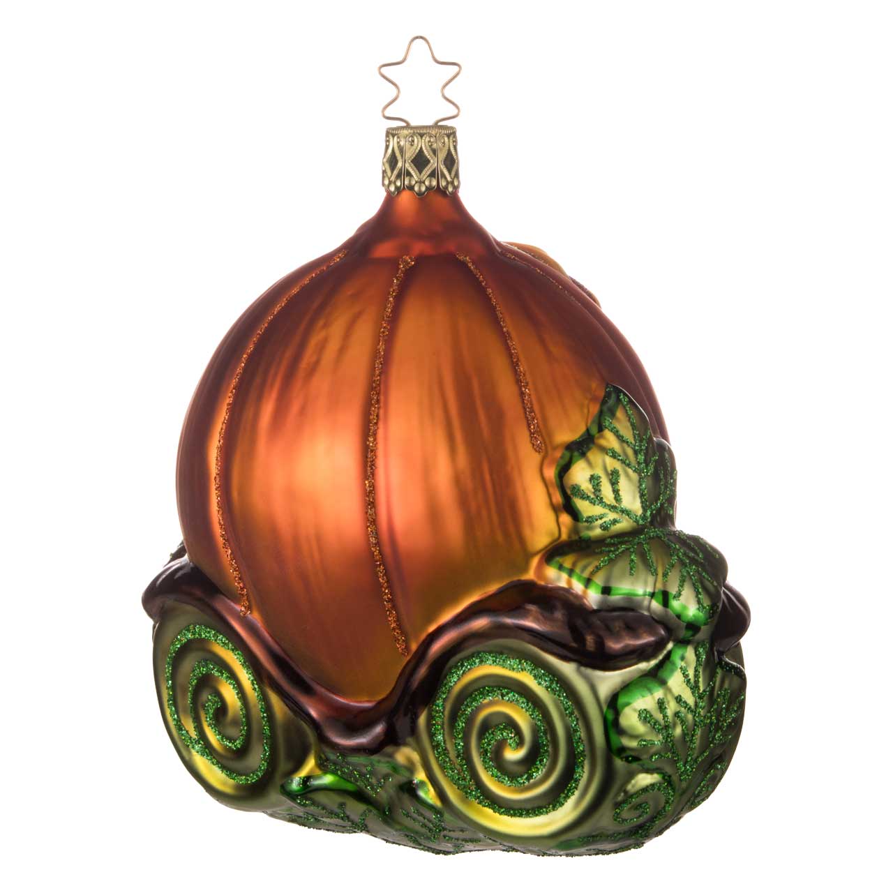 Detailed carriage in the shape of an orange pumpkin with green wheels and leaves. Cinderella leans in a gilded window with a sparkling tiara and silver shoe in her hand. Colorful design in orange, green, gold and red with glittering accents.