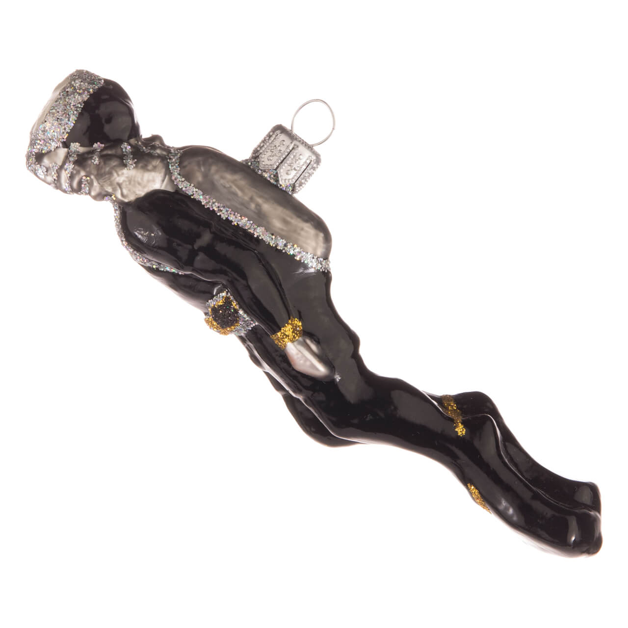 Just like this filigree diving figure made of glass, which is lovingly painted and brings the popular hobby (which is often also a vocation) to the tree. The figure-hugging diving suit and the characteristic fins shine in classic black. The two oxygen cylinders on the back and the corrugated breathing tubes leading to the mouth are painted silver-grey with a silvery glitter. The visor of the diving mask shimmers in matt white and the glass is decorated with a wide, glittering silver band. Glittering golden cuffs on the hands and feet and a lavishly decorated belt provide sparkling contrasts.