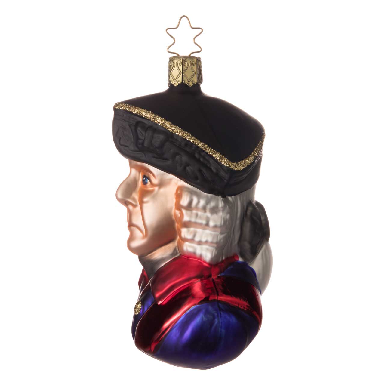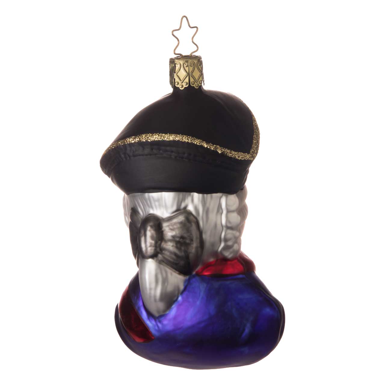 The Christmas bauble depicts Frederick the Great as a detailed bust. With lifelike facial features, a white curly wig, black tricorn hat with golden trim and a uniform in bold blue and red with golden accents, it looks particularly impressive.