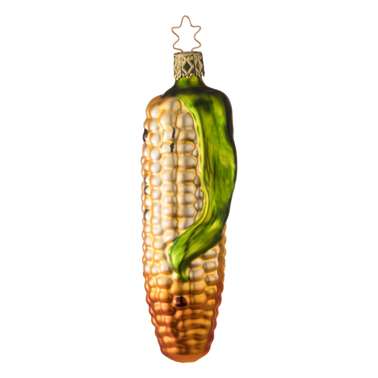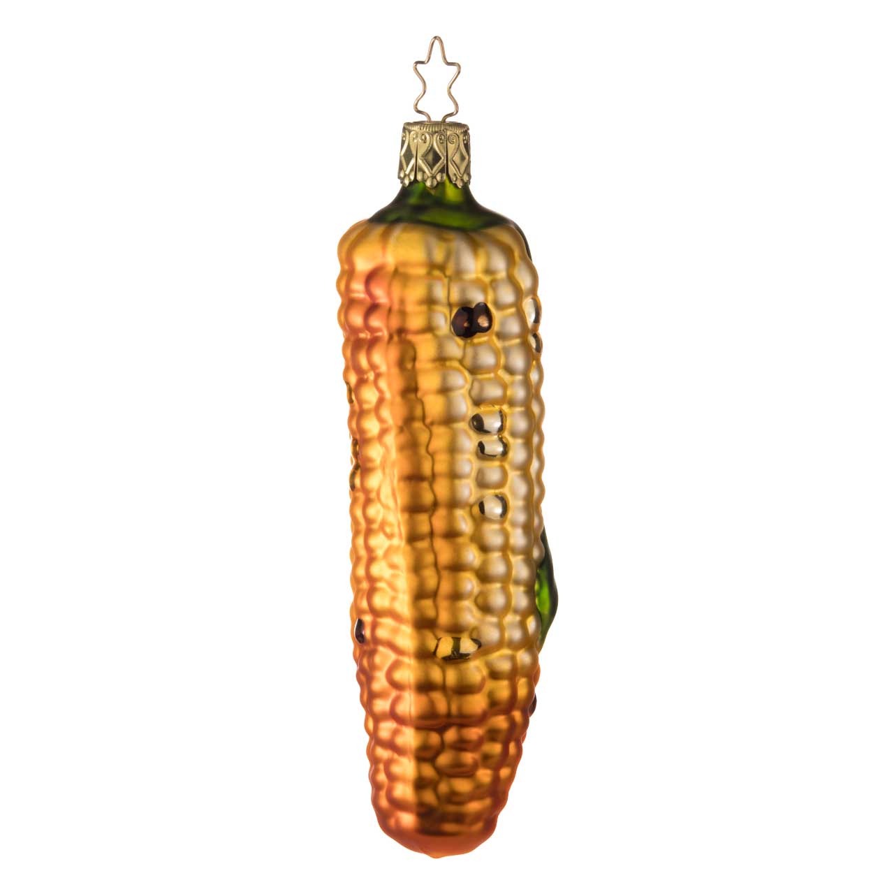The ball is designed as an elongated corn cob and features realistically crafted, golden-yellow to slightly tanned kernels and an implied green leaf. The figure impresses with its slender shape and warm yellow, gold and green tones, which give it a lively and appetizing look.