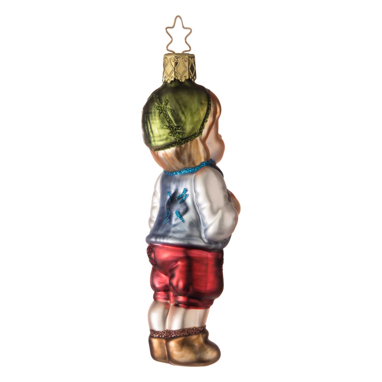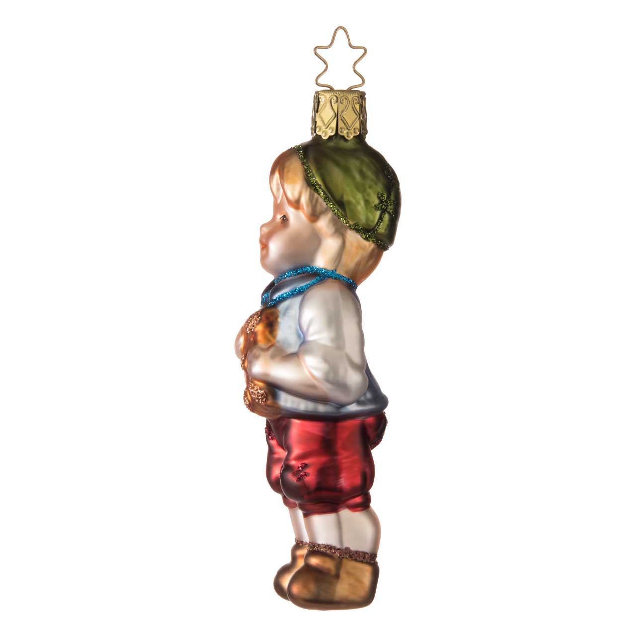 The ball shows a standing boy figure in an elongated shape with loving details. The color scheme is dominated by warm tones such as red for the trousers, a light, slightly shimmering white for the shirt and green and gold accents on the cap and details. The figure is holding a brown and gold piece of gingerbread in his hands, which further emphasizes the motif.
