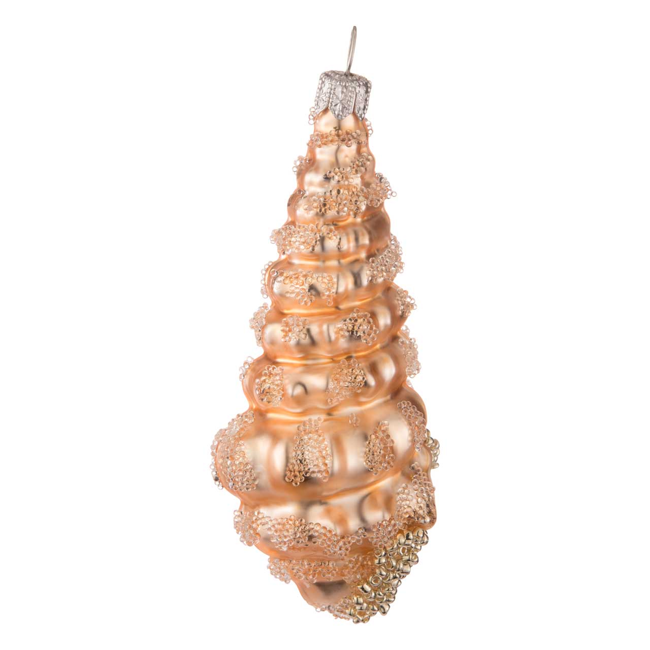 This specimen has a slender, pointed shell with a clear spiral structure. Transparent glitter enlivens the surface structure of the spindle. The mouth is lined with sand-like golden glitter.