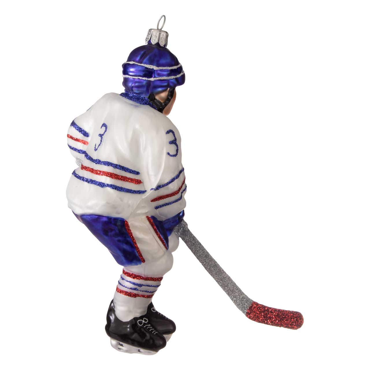 The depiction shows an ice hockey player in full action, dressed in a white jersey with blue and red glitter stripes. The helmet and gloves shine in bright blue, while the stick is decorated with silver and red glitter. His stance conveys dynamism and concentration - as if he were in the middle of a game.