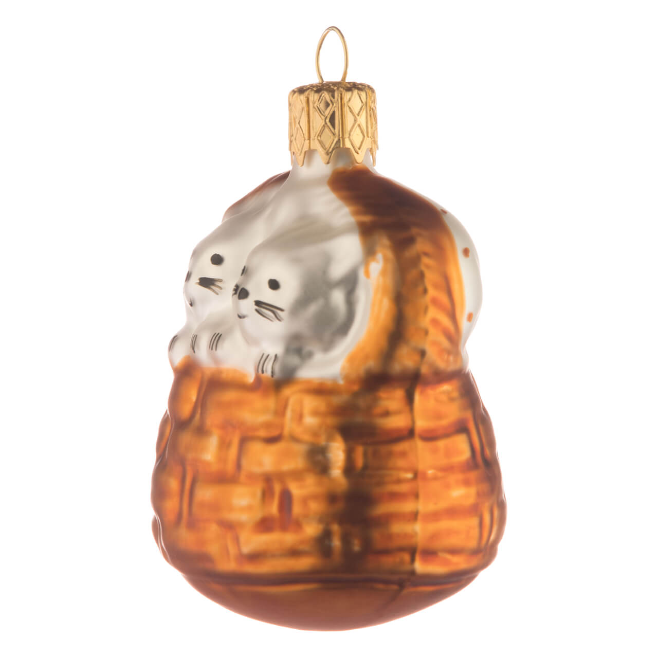 Kittens in themselves always make hearts beat faster. When they also peek out of a brown wicker basket, as they do in this glass figurine for the Christmas tree, many a viewer will be smitten.