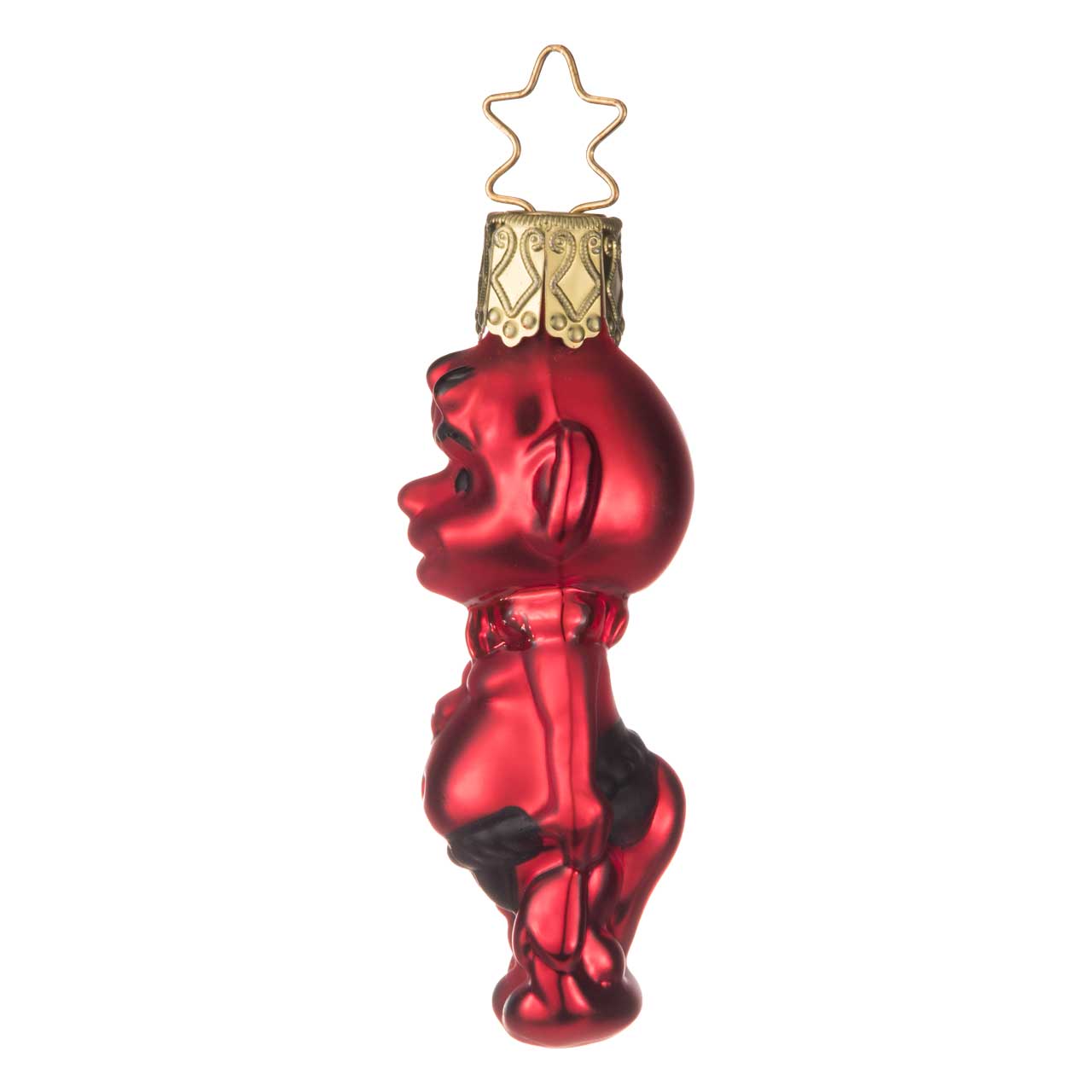 The figure shows a little devil shining in bright red with black details on his trousers and collar. The round shape with accentuated head, small belly and broad grin gives it a playful, almost childlike character. A striking piece that immediately catches the eye with its bold color contrast.