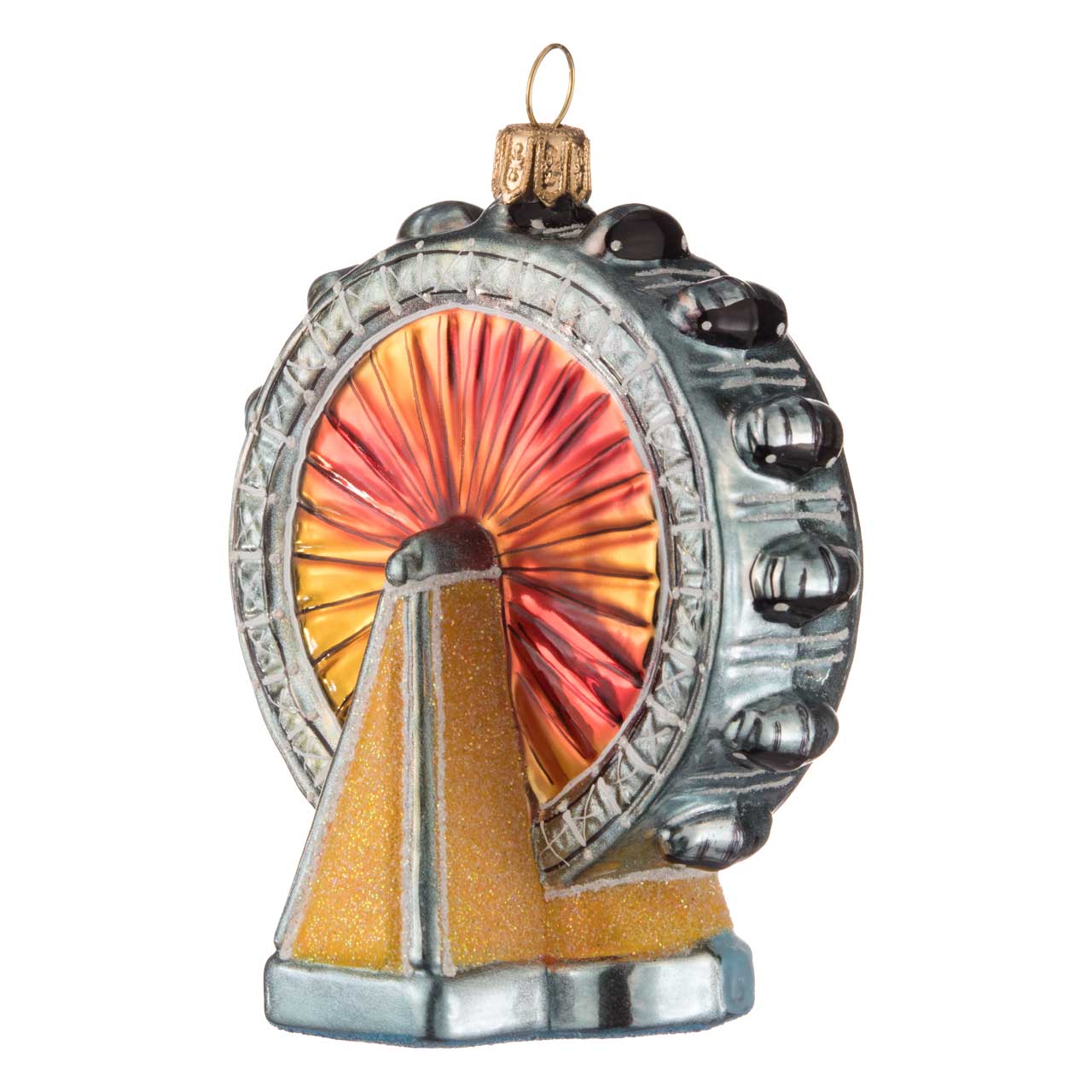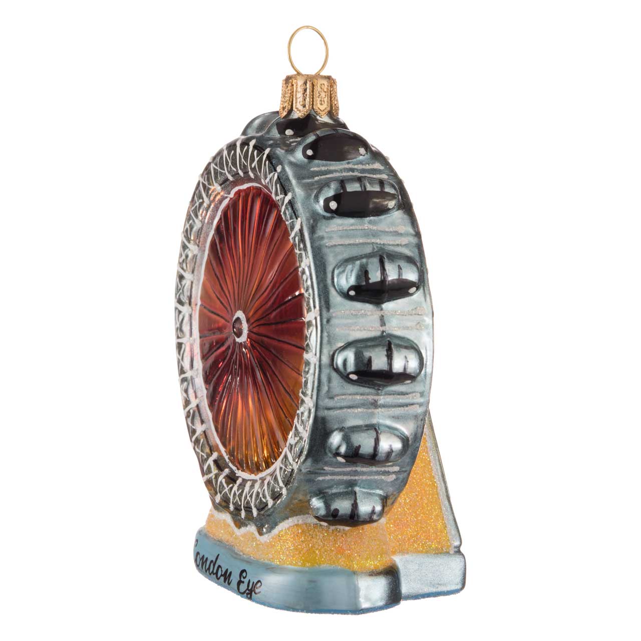 Filigree lines trace the shapes of the Ferris wheel, making it easy to recognize its structure despite its Christmas bauble shape. The gondolas for the passengers are clearly visible on the outer metallic blue-grey ring. The inner area of the wheel with the tensioning elements appears to glow red in the evening sun. At the base is the inscription "London Eye". This makes it impossible to confuse it with one of the world's other gigantic Ferris wheels.