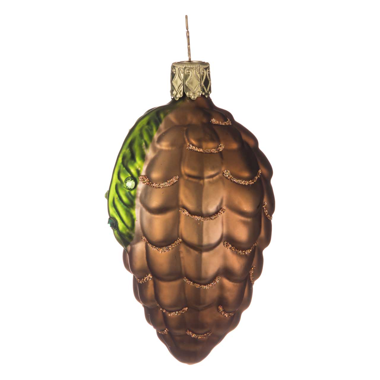 The detailed reproduction shows a brown cone with a finely highlighted scale structure, which is emphasized with subtle golden accents. A green pine needle with sparkling gemstones provides an additional color accent and gives the motif an elegant, festive touch. The shape is elongated and lifelike, with a harmonious combination of earthy and shiny tones.