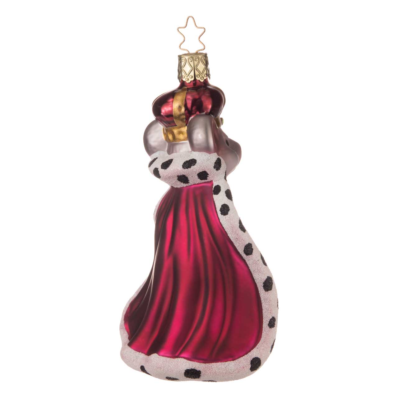 The Christmas bauble depicts a silver-grey mouse king in an upright pose, dressed in a red coat trimmed in white and black with golden details. He wears a red and gold crown with green gemstones on his head and a sparkling sash over his shoulder. He holds a small sceptre in his hand. The colors red, gold, silver and white dominate the motif and give it a festive, royal glow.