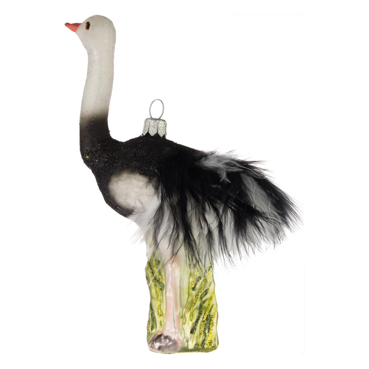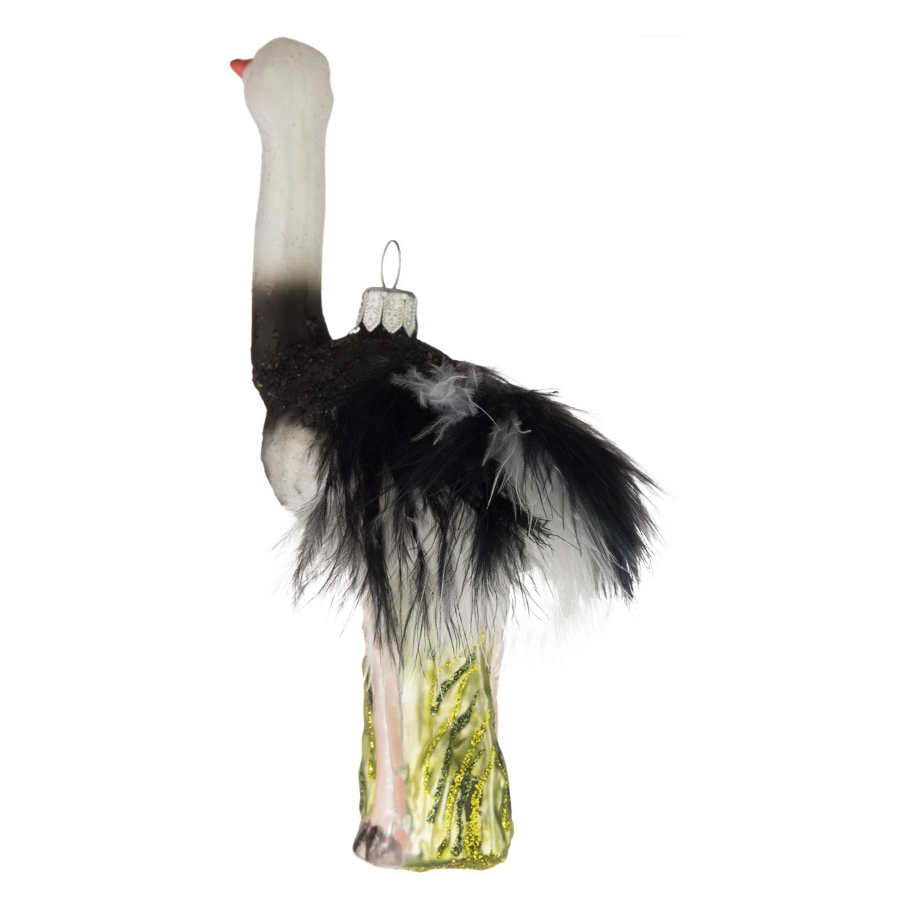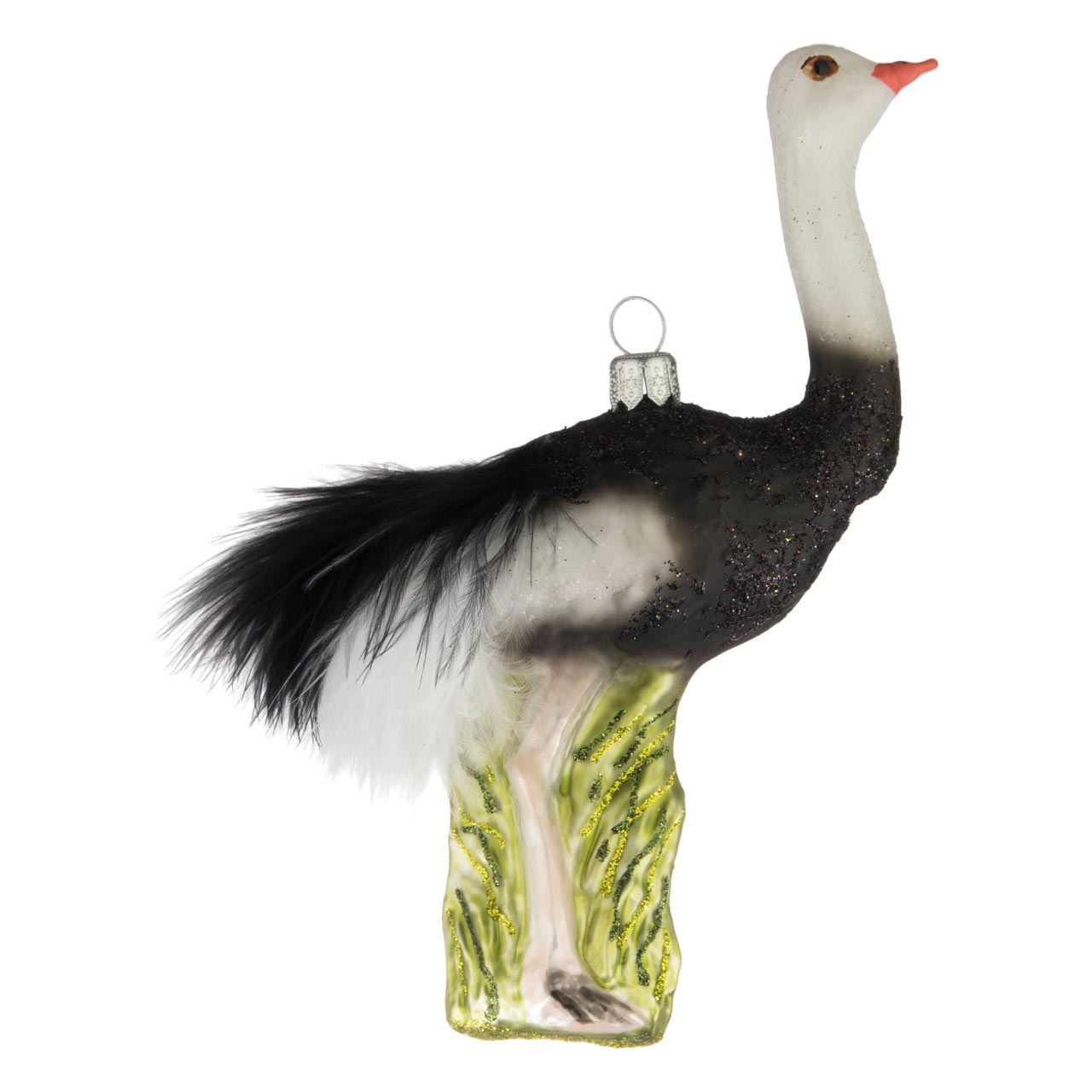 In elegant matt white and black, the ostrich now also attracts admiring glances as a Christmas tree figurine: the elegant animal stretches its long neck with an orange beak upwards in an elegantly glittering manner. The skin-coloured legs stand in the belly-high glitter grass. The absolute highlight: real, glued-on white and black feathers give the rear rump a light, airy curve.