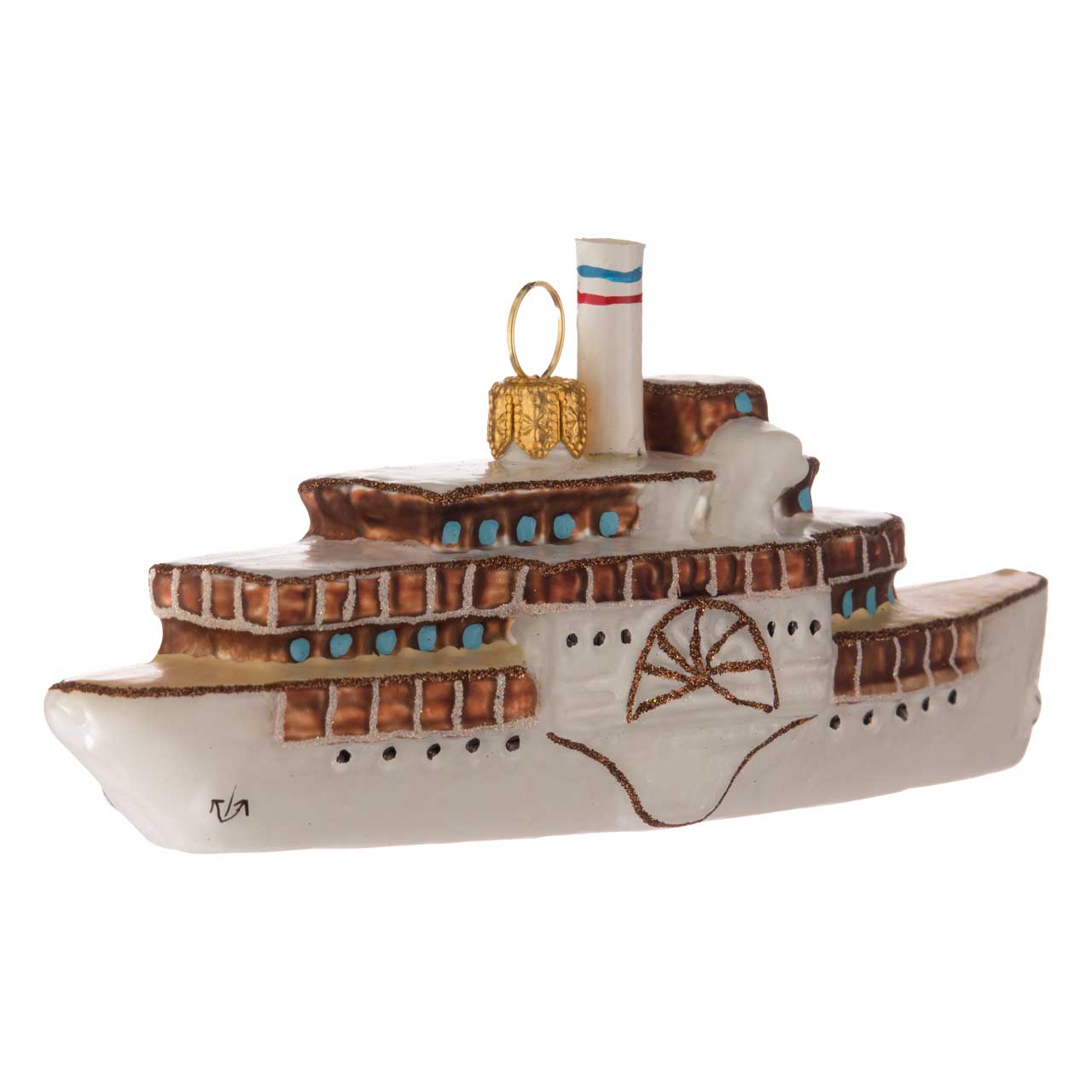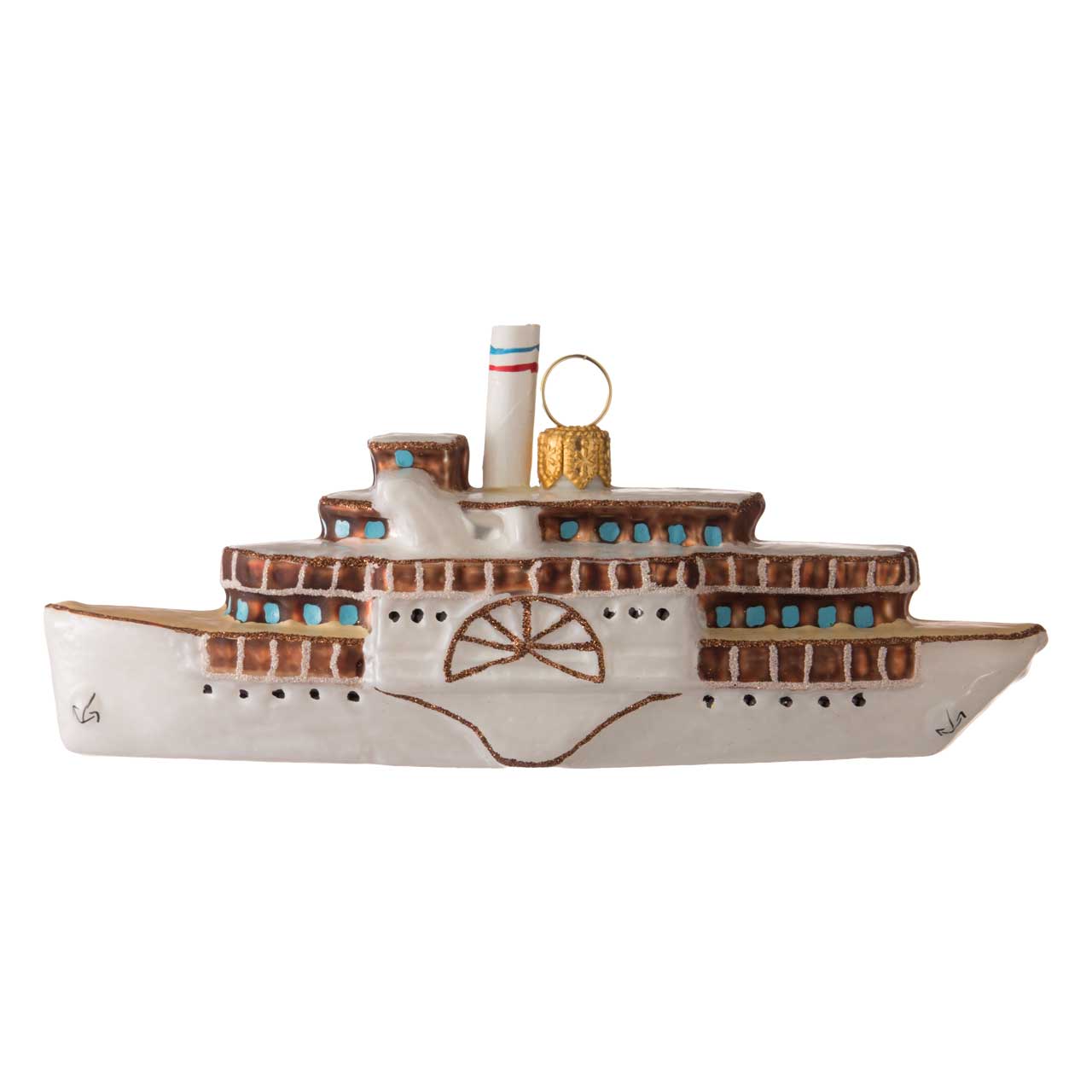 This detailed depiction shows a classic paddle steamer in pearl white with bronze-colored decks and fine golden accents. The small turquoise-blue windows give the ship a fresh touch, while the striking paddle wheel is artfully emphasized on the side. The white funnel with subtle red and blue stripes rounds off the harmonious overall picture.