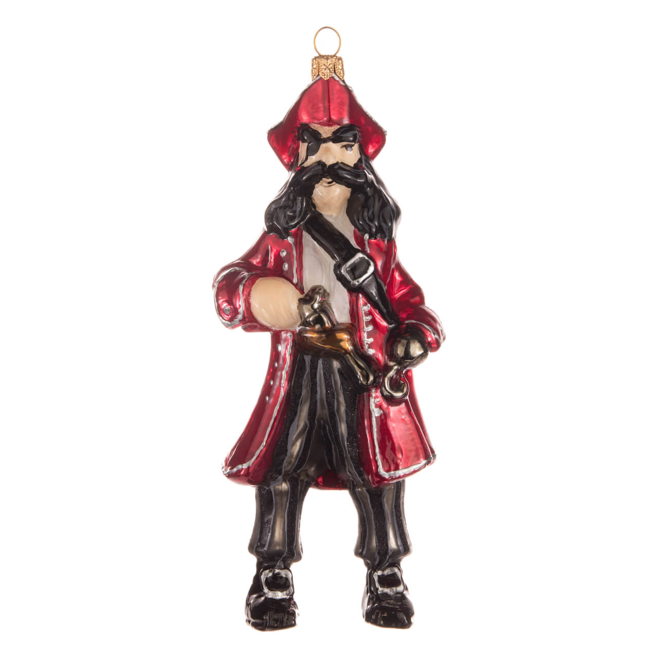 In a flying pose, his right arm stretched forwards eagerly, Peter floats along on a golden cord in green, Robin Hood-like costume, complete with pointed hat and brown boots. Captain Cook, naturally standing with his legs apart, wearing dark, striped trousers, an open red uniform skirt, a tricorn hat on his head, long black hair and a striking eye patch on his face, lives up to his name as a pirate. However, the other two are also particularly impressive: the large, shiny green crocodile and the black pirate ship with its many lovingly crafted details.