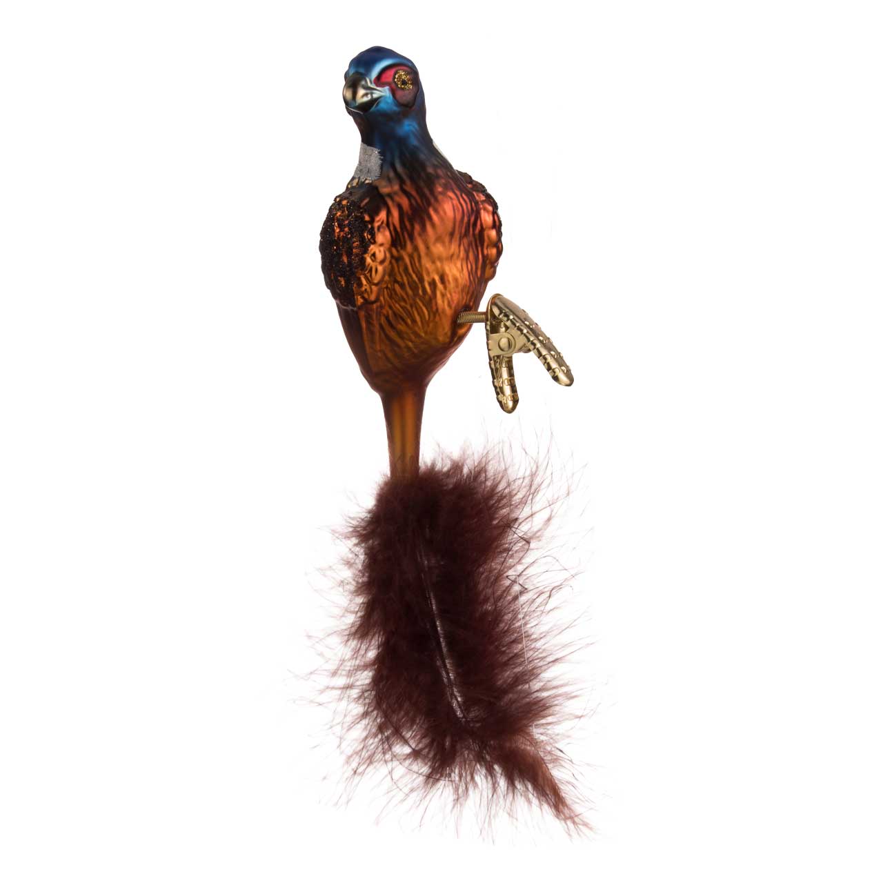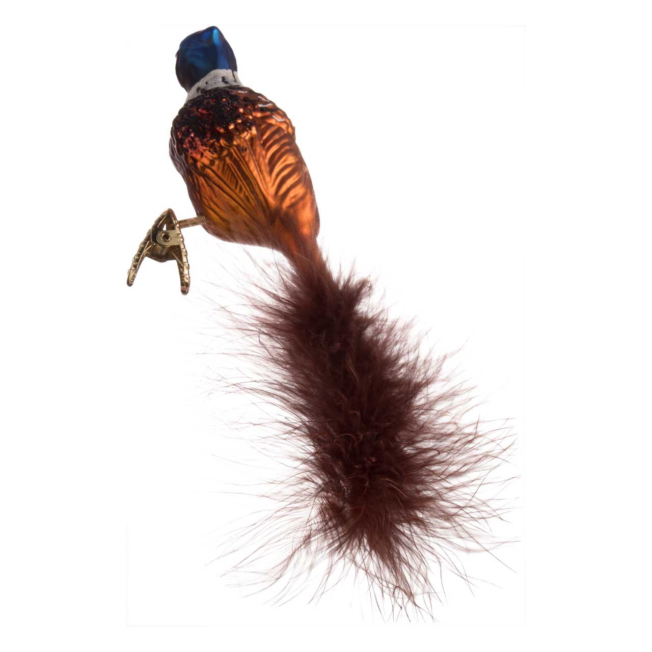 This specimen for the Christmas tree is no exception. It shimmers elegantly with blue head plumage and the characteristic red eyes on a golden clip. A whitish glittering neck wreath forms the transition to the light brown rump. Dark brown glitter dust marks the wings on the right and left. Several real feathers, attached to the glass bird, form the tail of the ornate animal.