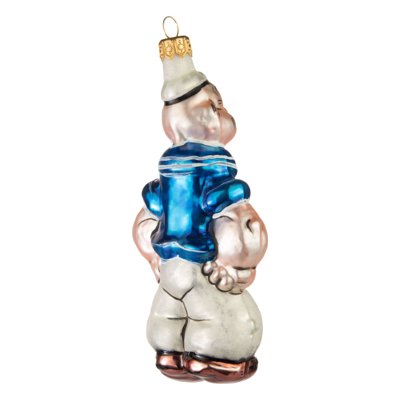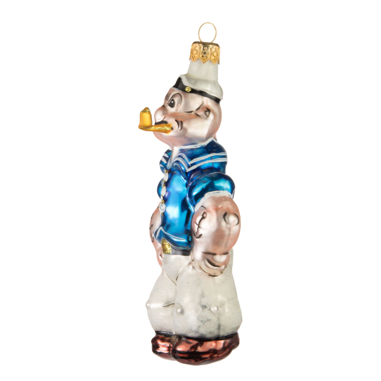 Striking is probably the best way to describe the expression on his unconventionally pinched face, which has been applied to his delicate pink head with careful brushstrokes in the usual one-eye-on-the-other manner. The wide mouth under the bulbous nose is also wonderfully crooked. One corner of his mouth is grinning, the other has a delicate, translucent golden-orange pipe in it. Popeye's tattooed arms are not only gripping his pelvis, they are also raised with a certain pride. As if he wanted to show off his pretty sailor outfit: The shirt, decorated with the typical collar and gold and white buttons, shines blue, and the belt buckle is also set in a glittering gold colour. The trousers and cap have also been dusted with white glitter for a Christmassy touch.