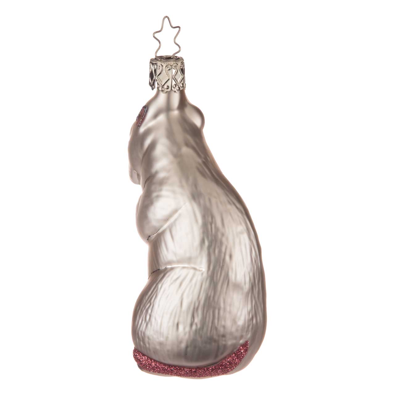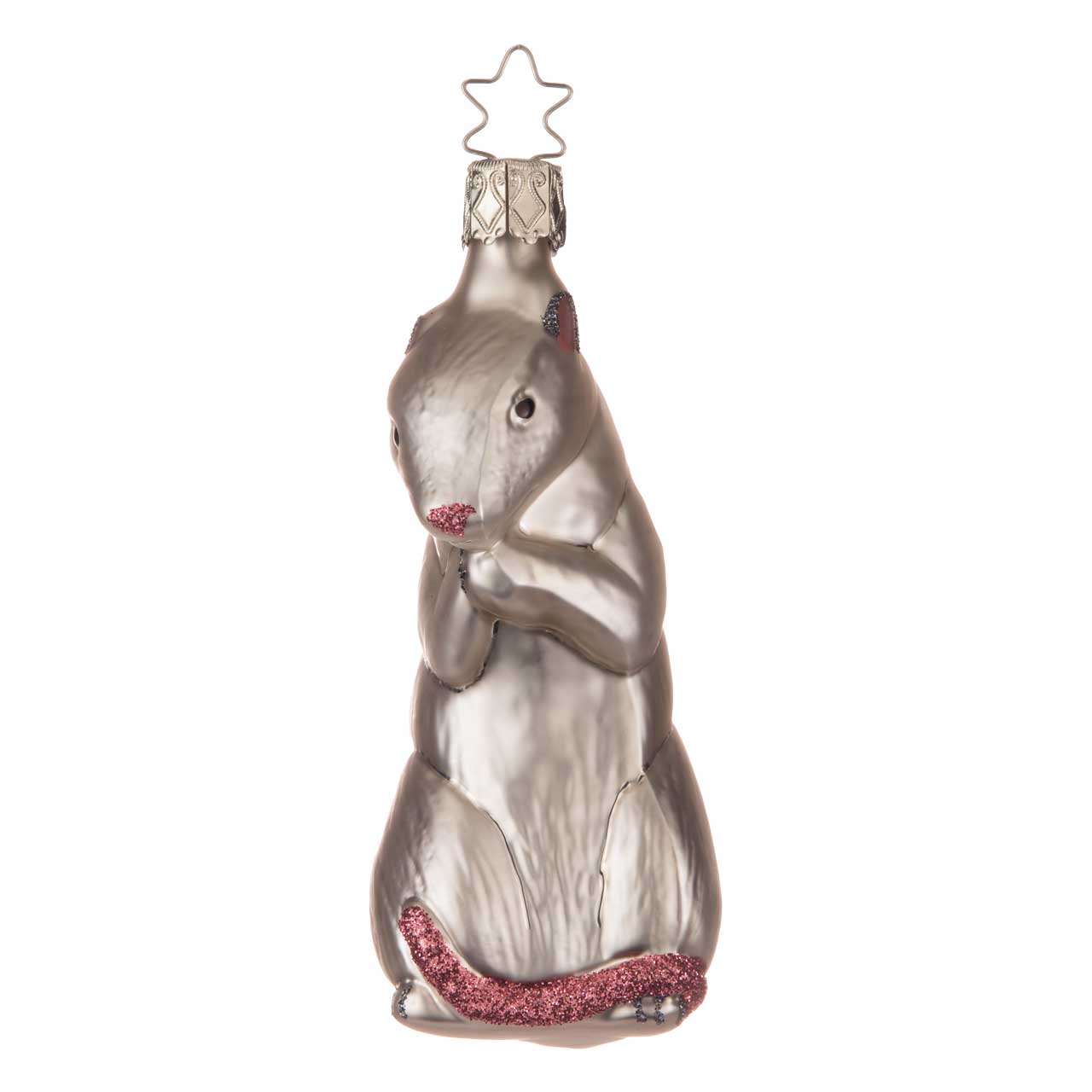 Here the rat is shown in an upright position with its paws together - almost as if it is in silent observation or anticipation. The fur is designed in silver-grey tones, while fine details such as the pink nose, the glittering ears and the long, sparkling red tail enliven the overall picture. The shape is lifelike and slender, with a slightly curved body that looks lively and elegant.