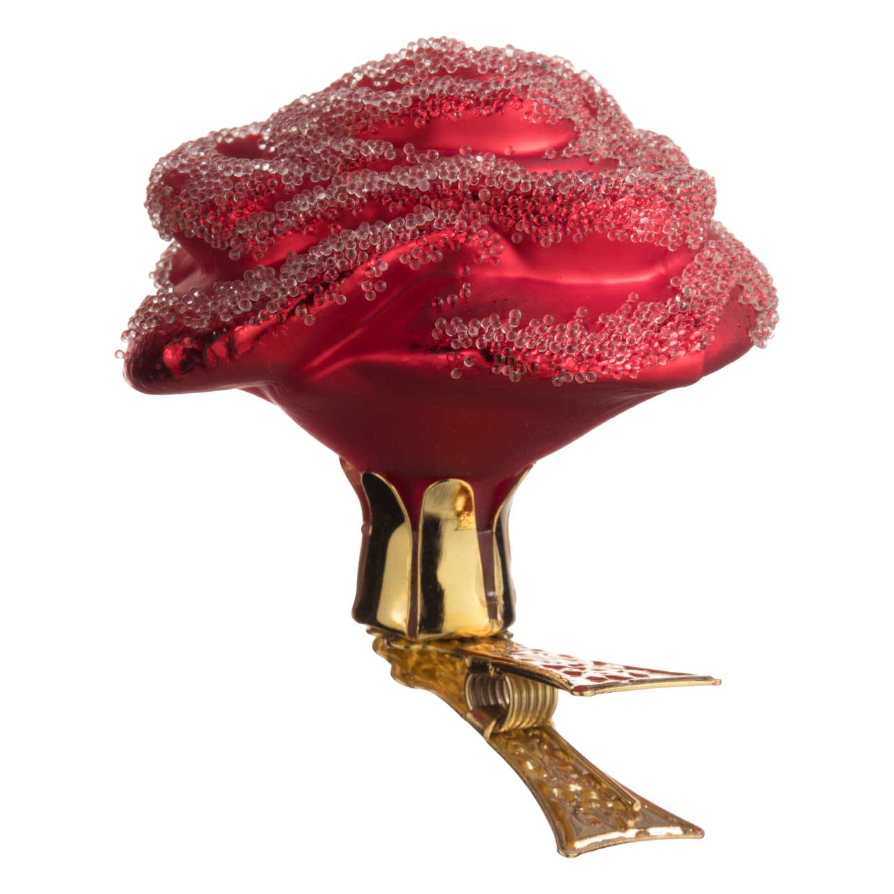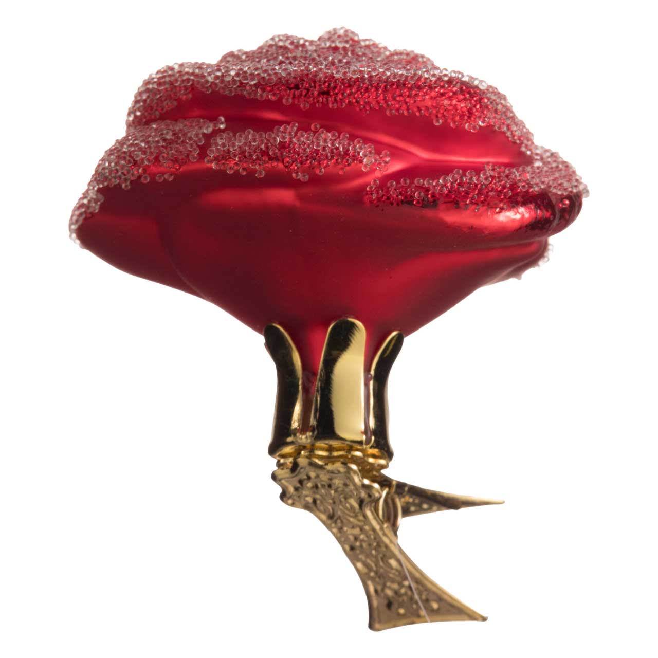 This elegant design shows a stylized, shimmering velvety red rose with finely sculpted petals. Delicate glass beads on the edges give the flower the appearance of being covered in dewdrops. The gold-colored calyx creates an elegant contrast and lends the design a luxurious touch.