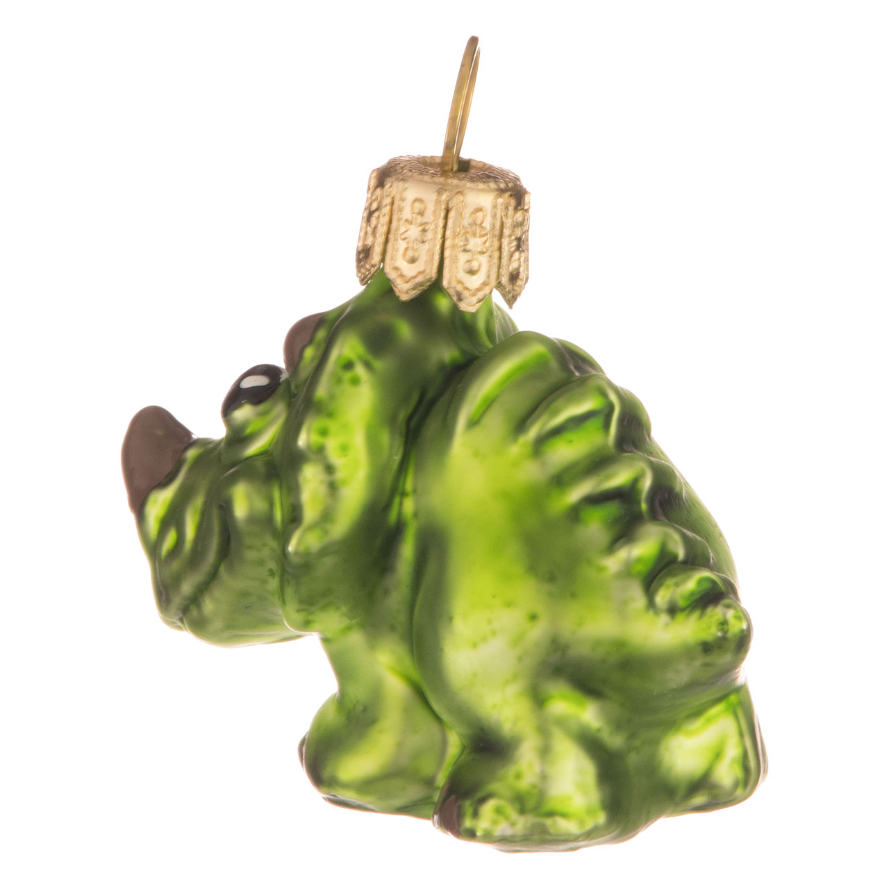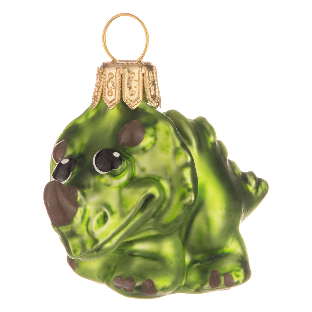 As a glass figure or figurine for the Christmas tree, it doesn't really impress with its size to be honest, but it does with its lovely composition of a wonderfully matt, slightly blotchy shade of green, shiny brown horns and funny, black and white googly eyes, which make the little animal a real favourite and turn almost everyone into a dinosaur fan.
