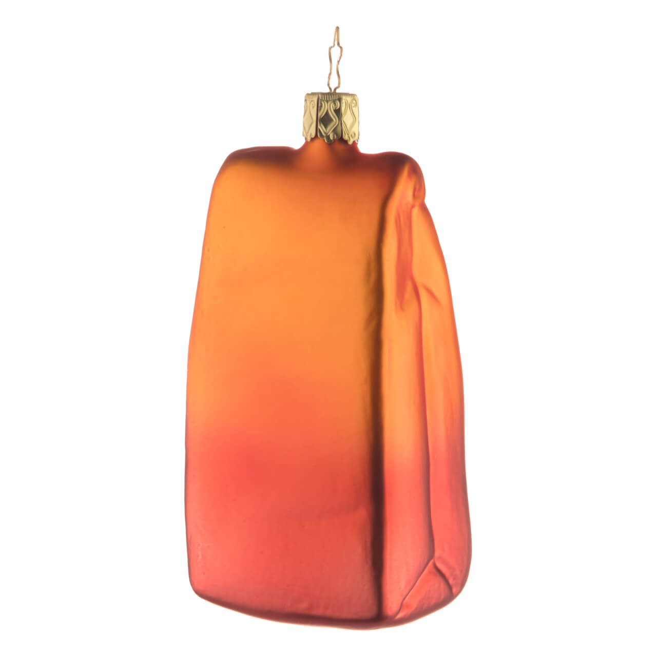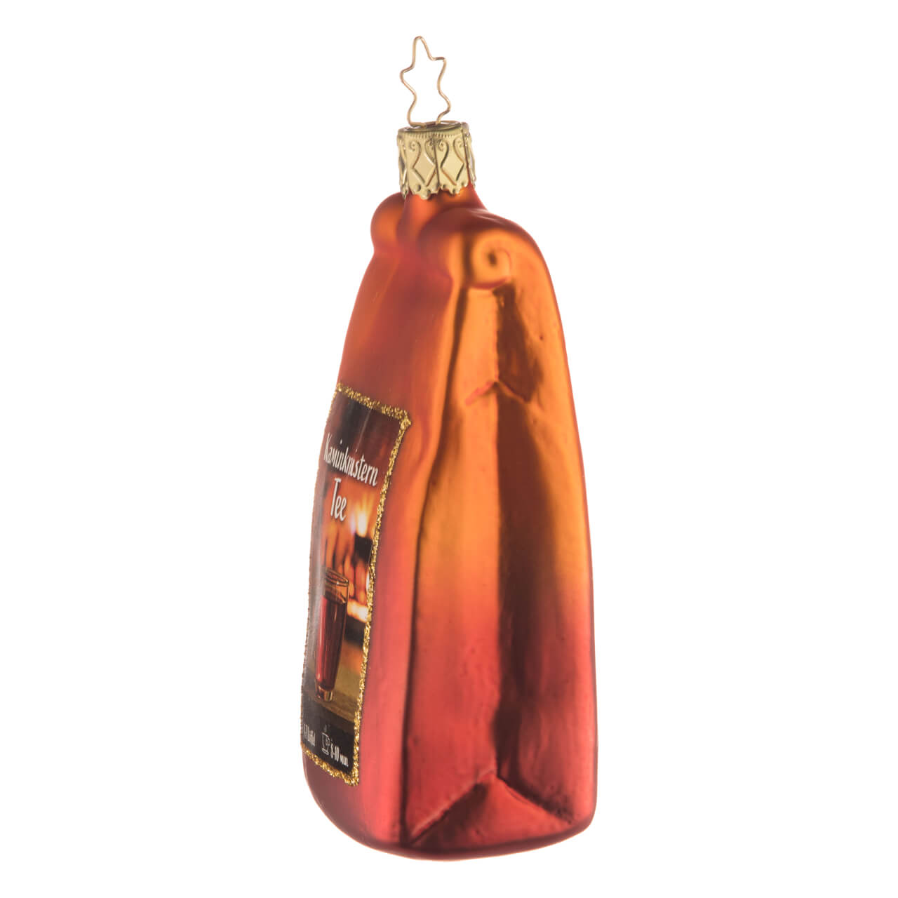 Perhaps it's this particular flavour that's presented here as a clever package for the Christmas tree? The bag shimmers red-orange as if it had just been bought from the tea shop; the opening is classically rolled up and the front has a promising, glittering gold-framed label. "Chimney crackling tea" is written on it in slightly curved letters. The words "1-2 spoons" and "8-10 min" infusion time also promise a flavour similar to that of a real packet. And the right visual ambience is also provided: the background of the paper label is adorned with a glass jar filled with red fruit tea, placed in front of a blazing, warming open fire.