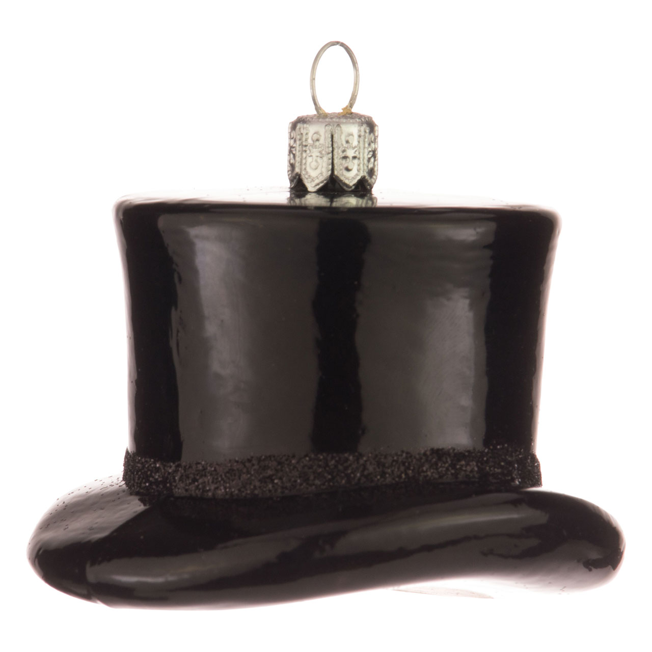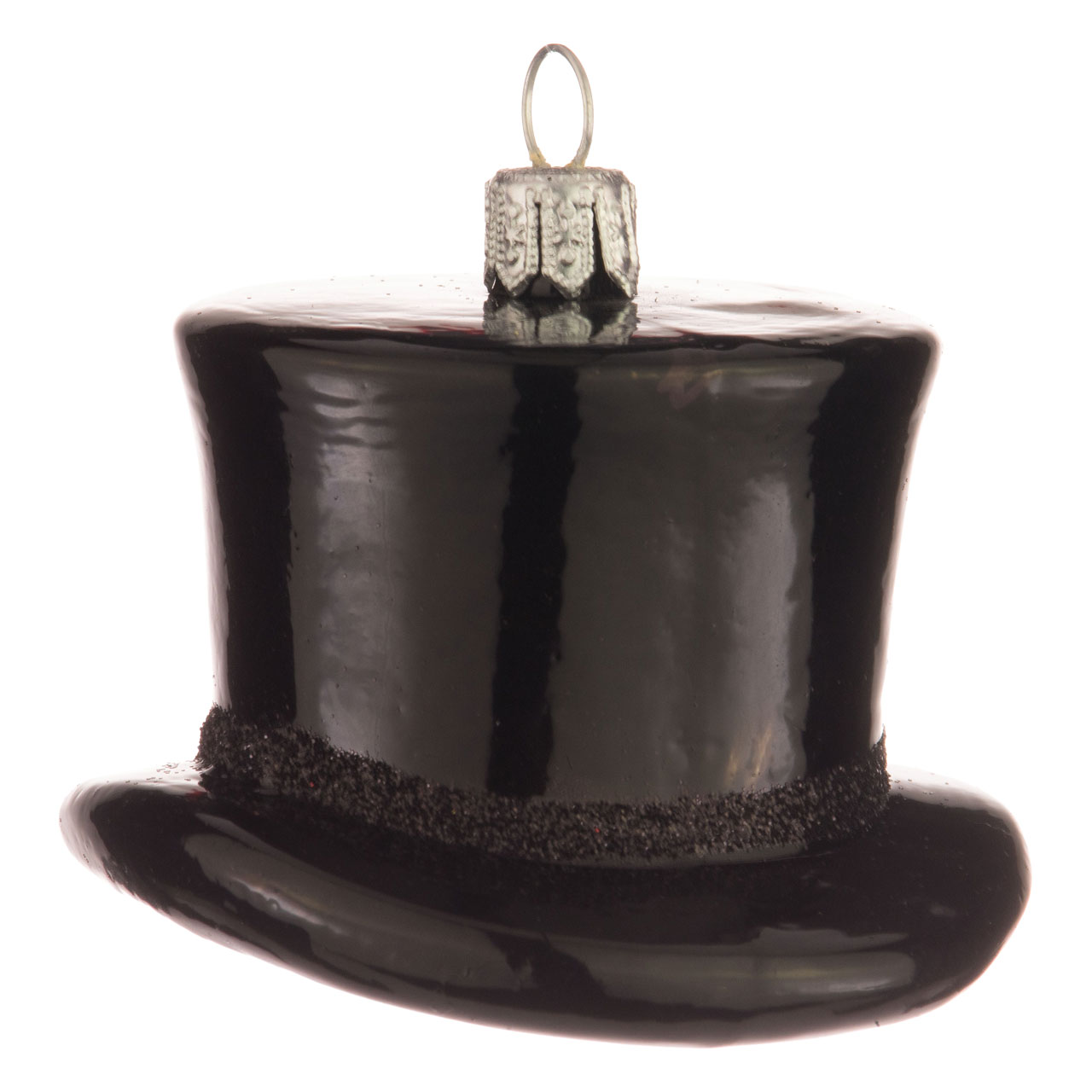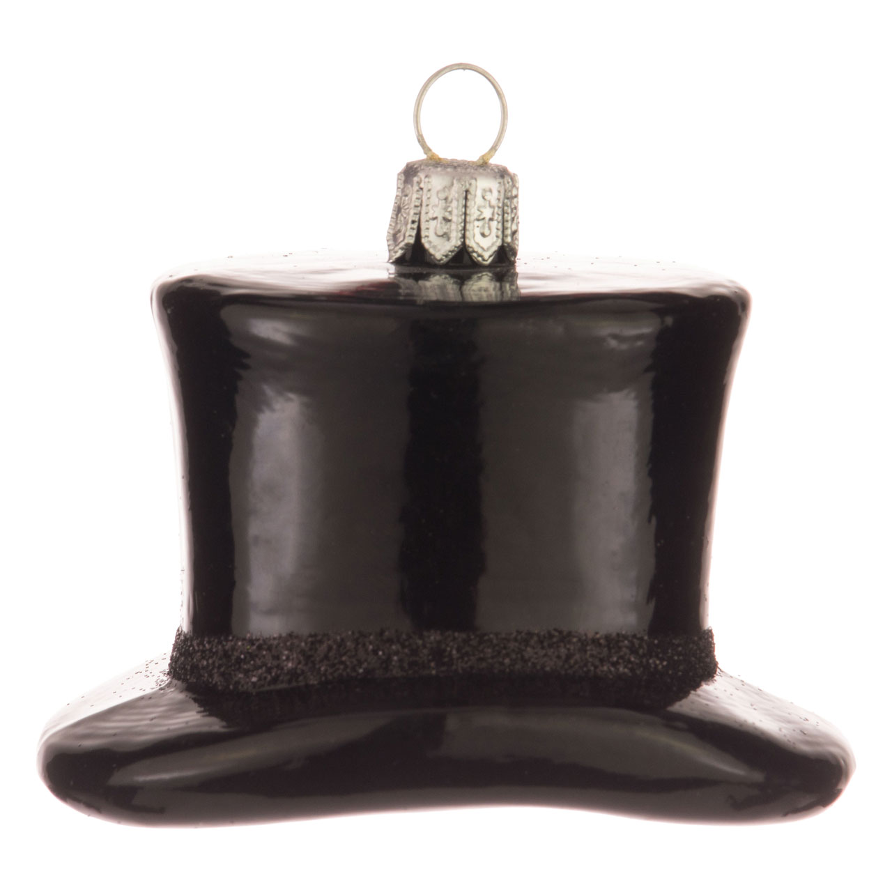 The characteristic hat with the stiff crown that widens slightly towards the top, the smooth roof, the curved brim and the narrow hat band symbolised by a black glittering stripe is too iconic. The hat itself is of course also black and wonderfully shiny, with a silver crown as a suspension. A small, ingenious detail: the underside of the top hat has an oval black matt varnish, which is intended to suggest the inner lining of the hat in an elegant and successful way.