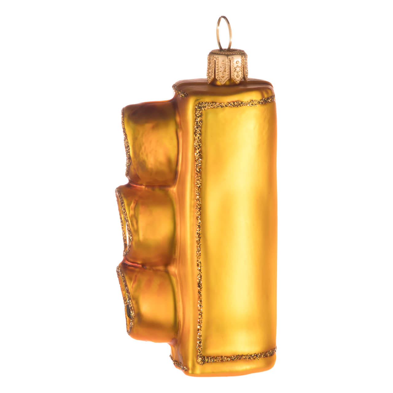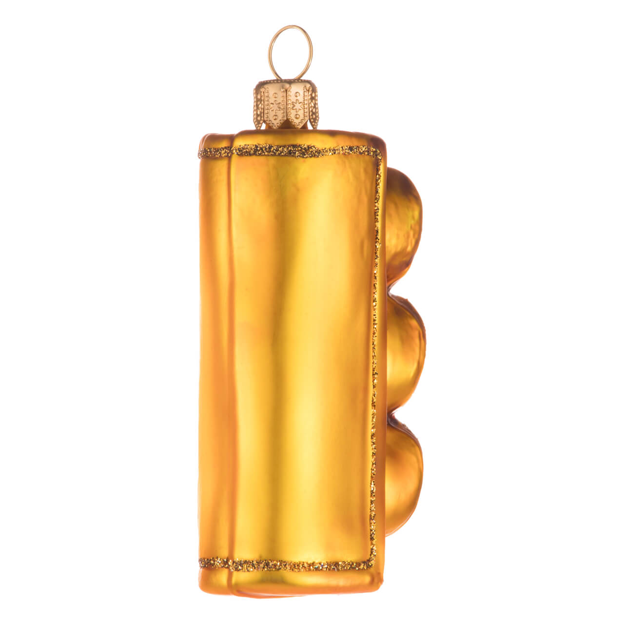... and whose yellow traffic lights have become world-famous, because as striking as they are hanging above the streets with their rich yellow housing, they also fit wonderfully into the Christmas tree as decorations. The Christmas tree light, which is elongated and decorated with golden glittering lines and dangles from the golden crown, shimmers in a matt golden yellow. The three round lights in the front? They shine together this time - so that the typical colors can be easily recognized: a bright red, a golden yellow and - of course - the always positive green. It's nice to wish you a safe journey, nonsense, Merry Christmas of course.