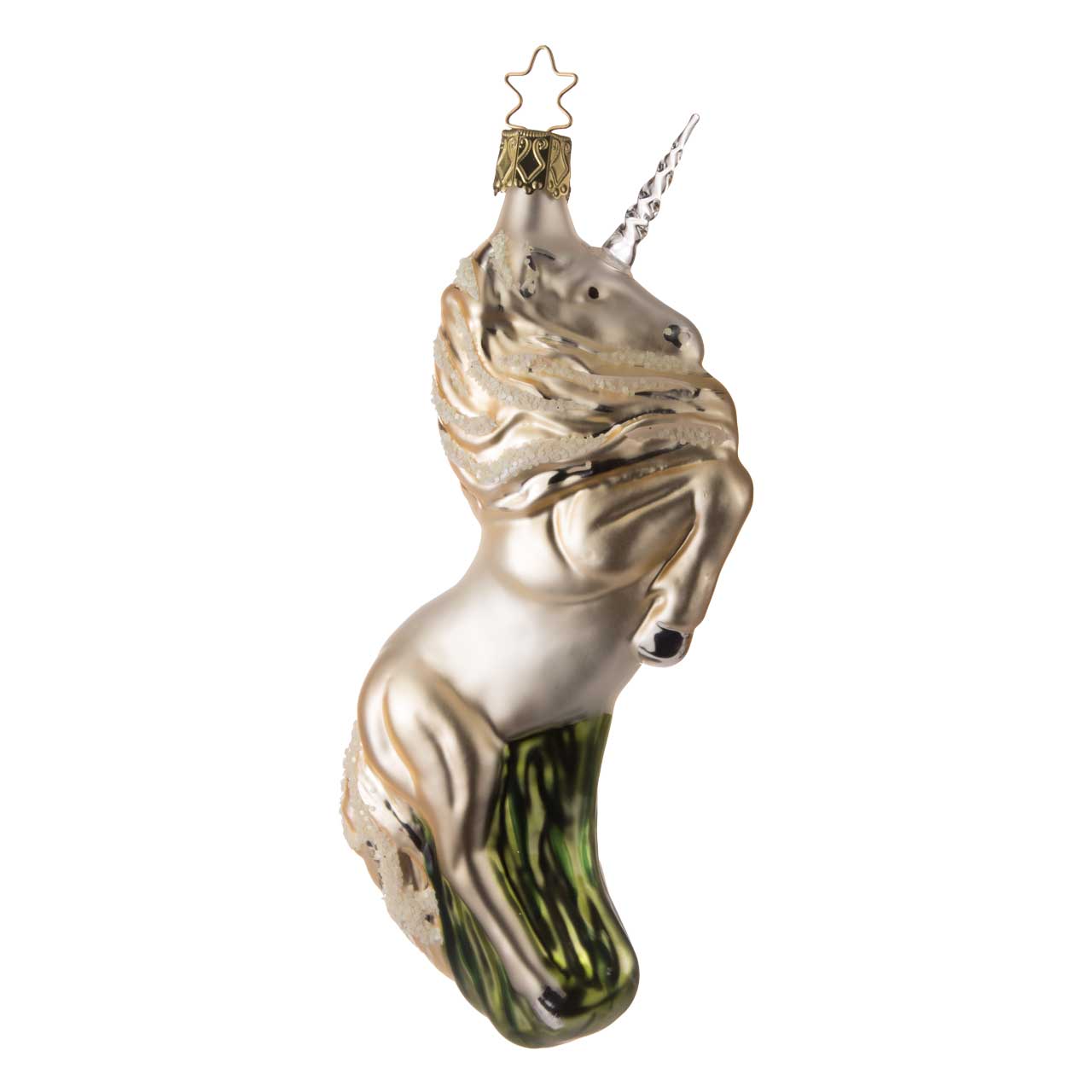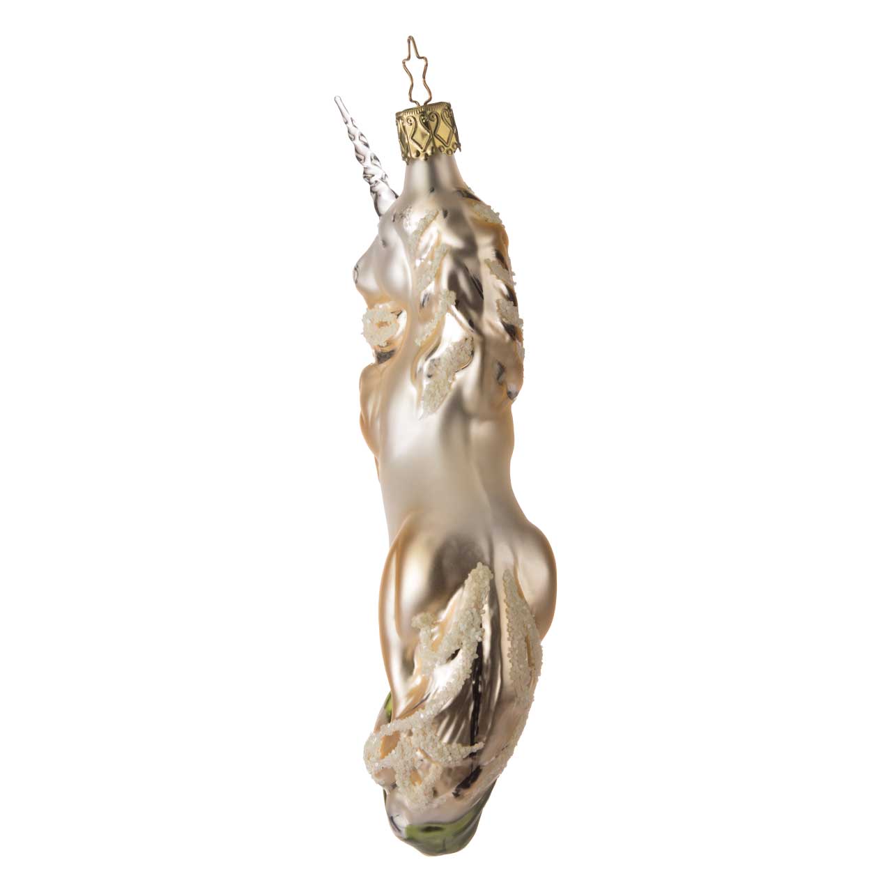 The figurine shows a rearing unicorn in an elegant, dynamic form. The body is in shimmering champagne and gold tones, complemented by fine glittering details and a transparent horn. Greenish accents at the bottom provide an additional splash of color. Overall, the sphere has a sophisticated, fairytale-like and slightly playful look.