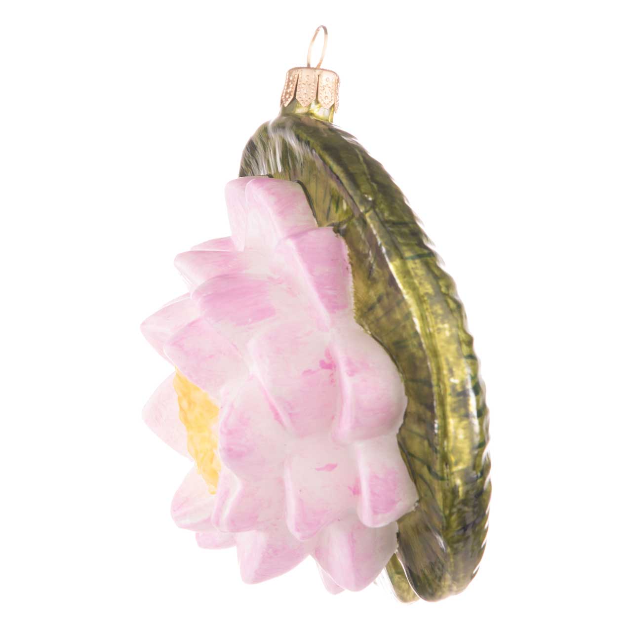 It goes without saying that the water lily is therefore also wonderfully suitable as an ornament on the Christmas tree - as a splash of colour in the midst of green branches: one side is designed with careful brushstrokes as a naturalistic-looking leaf, while the front presents a magnificent, open, wonderfully three-dimensional, matt pink and white blossom that surrounds a yellow interior. And the best thing is: as the green water lily leaf is flat, the glass figurine can not only be hung up, but can also be used as a wonderful table decoration.