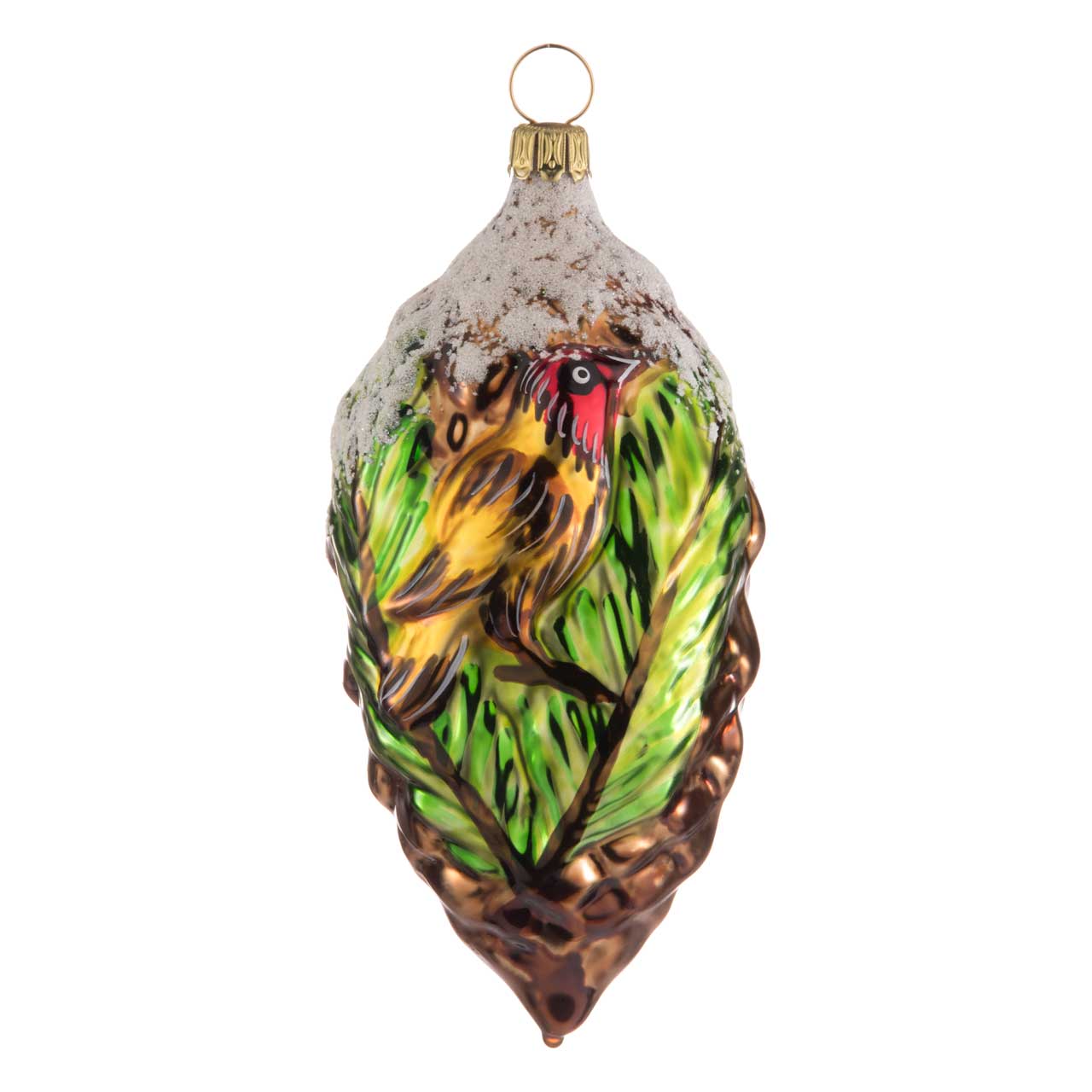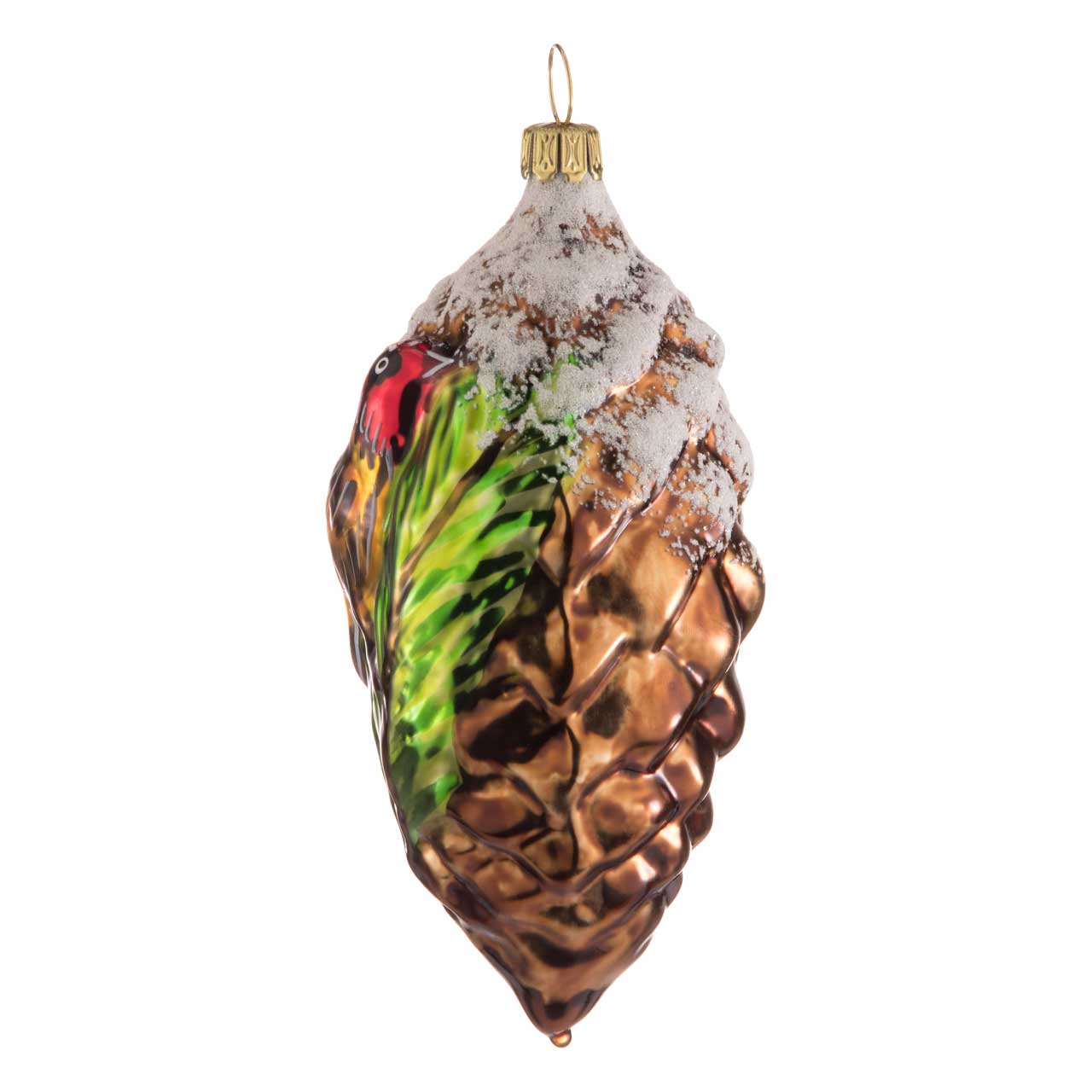 And while the back is naturally covered all over with brown scales, the front has been beautifully decorated. A small, golden bird with brownish striped plumage and a red head, very reminiscent of a goldfinch, shines in front of two draped, green coniferous branches.