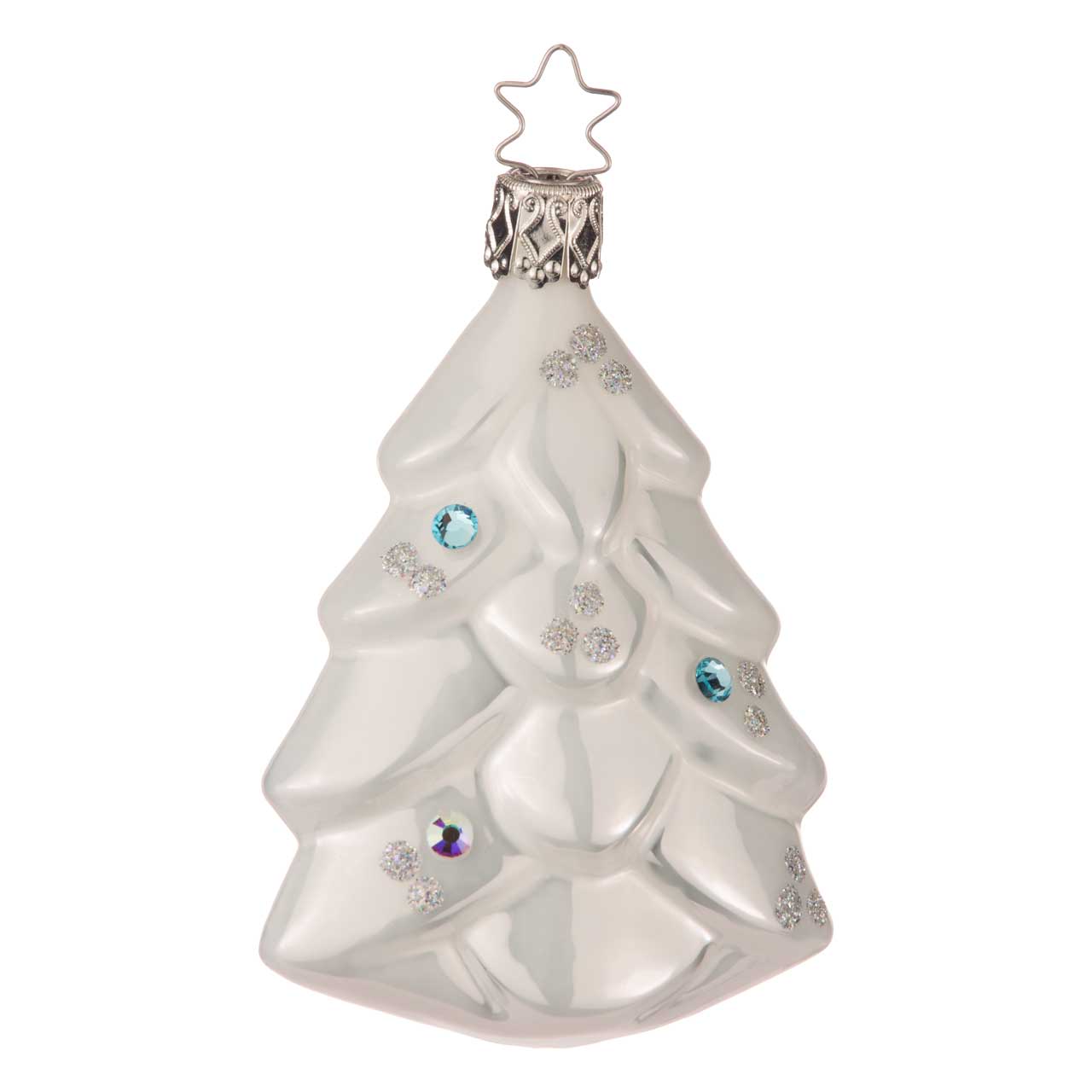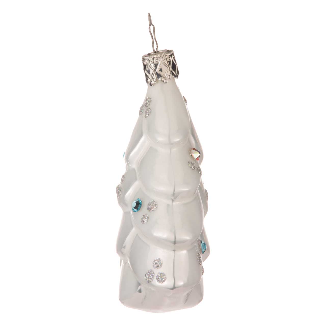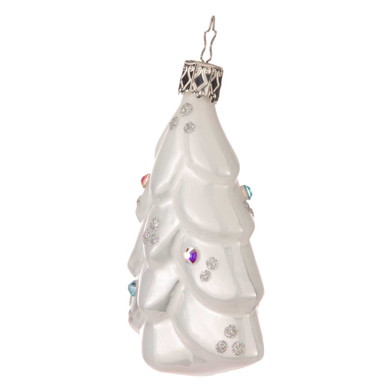 The bauble features a stylized fir tree with a pearly white sheen. The curved branches are decorated with sparkling silver glitter accents and several blue gemstones that look like small ice crystals. The shape is flat and clearly structured, which makes the elegant motif stand out particularly well.