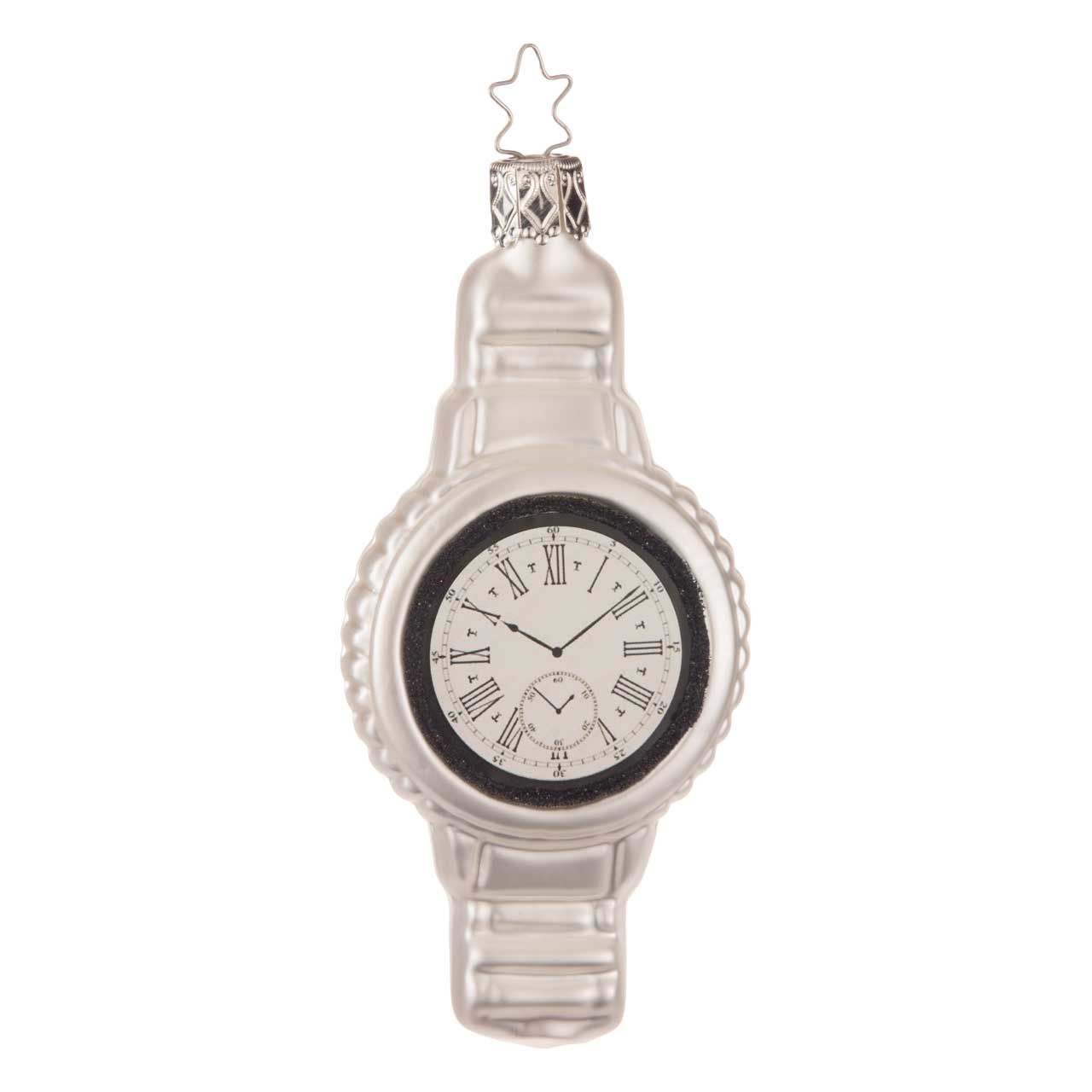 The watch has a silver case with a metal strap. Roman numerals indicate the hours on the dial, on which a small second hand circles at the bottom.