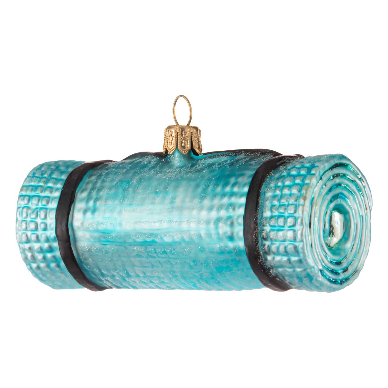 The turquoise yoga mat is still rolled up for the next exercise. A light waffle pattern can be seen on the surface, which is certainly not found on every mat. Black straps hold the mat tightly tied up as a roll. A handle for transportation comes off the top of the two straps.