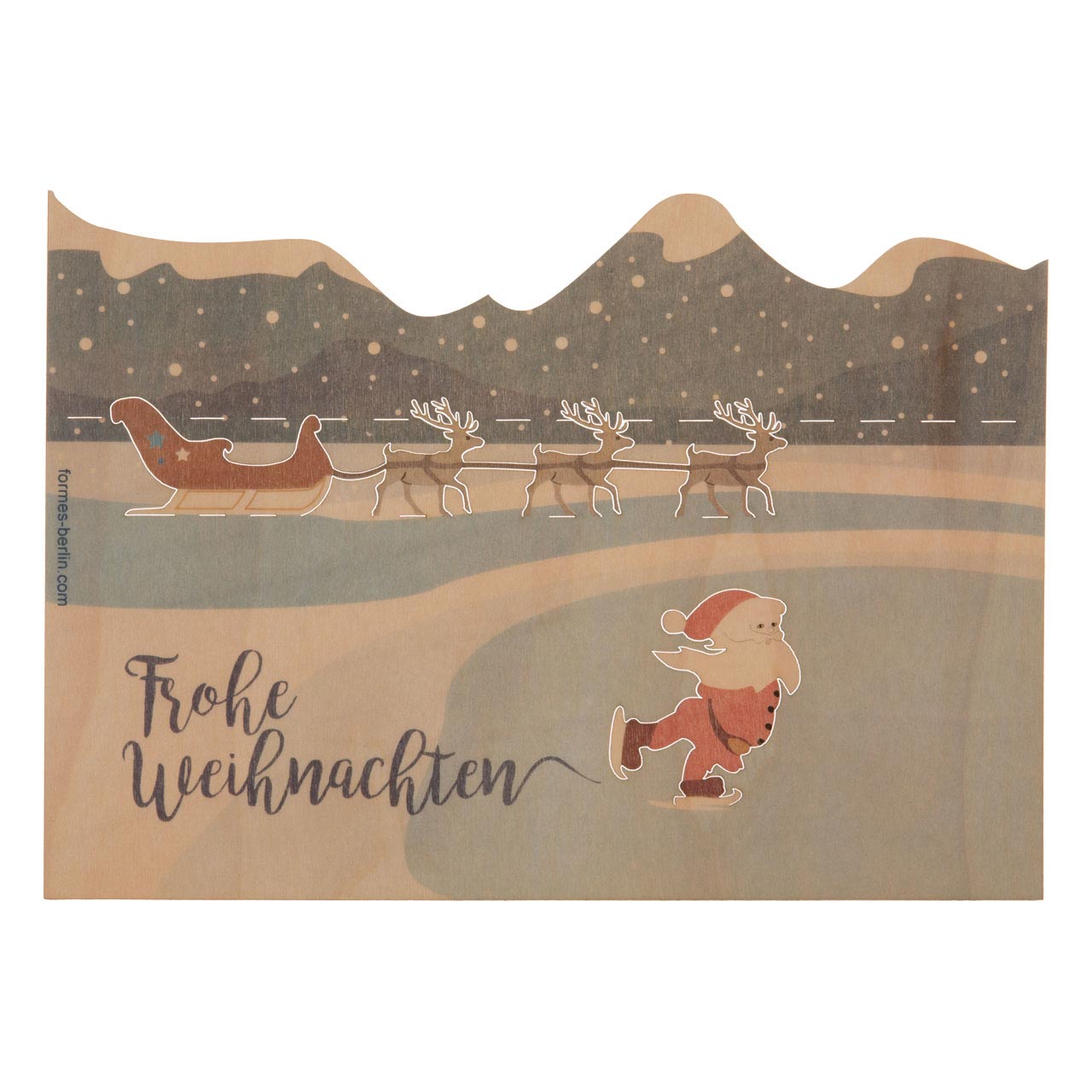 A skating Santa Claus, the sleigh with reindeer team behind it as well as the snowy winter landscape - actually a very common motif. Nevertheless, this card is something special! Made from fine birch wood, it has not only been printed in color, but also accurately cut using laser technology so that the addressee can carefully bend the motifs upwards according to the enclosed instructions. The winter landscape becomes three-dimensional!