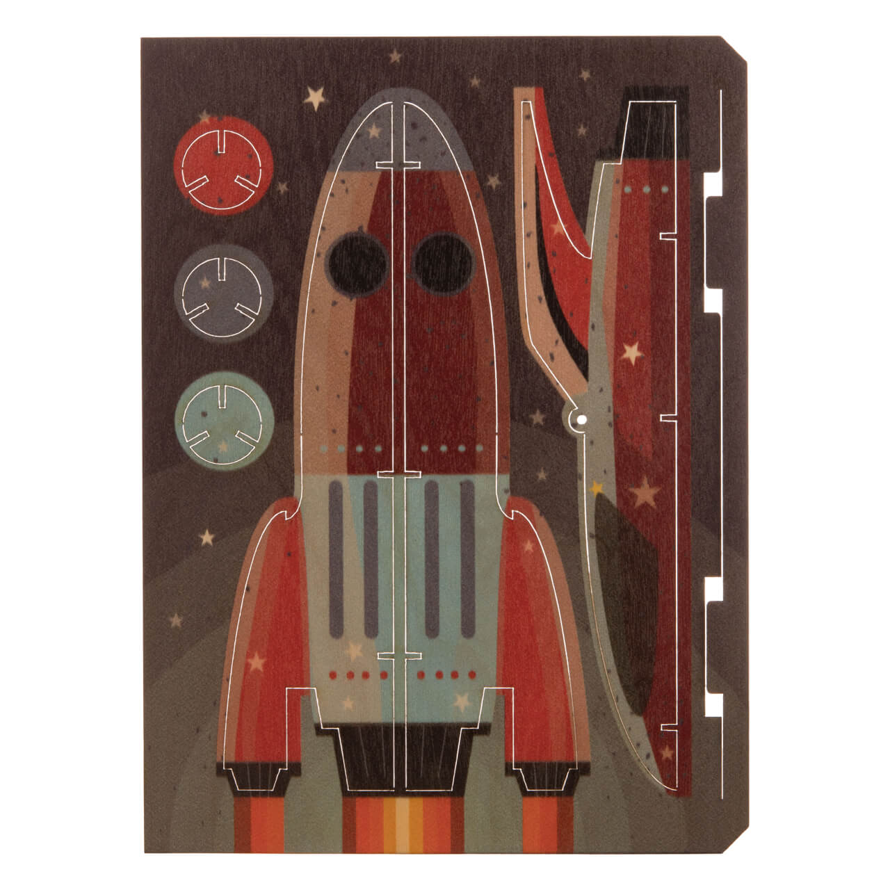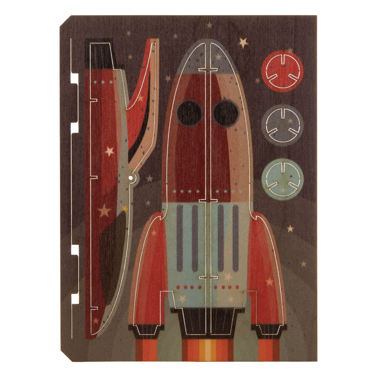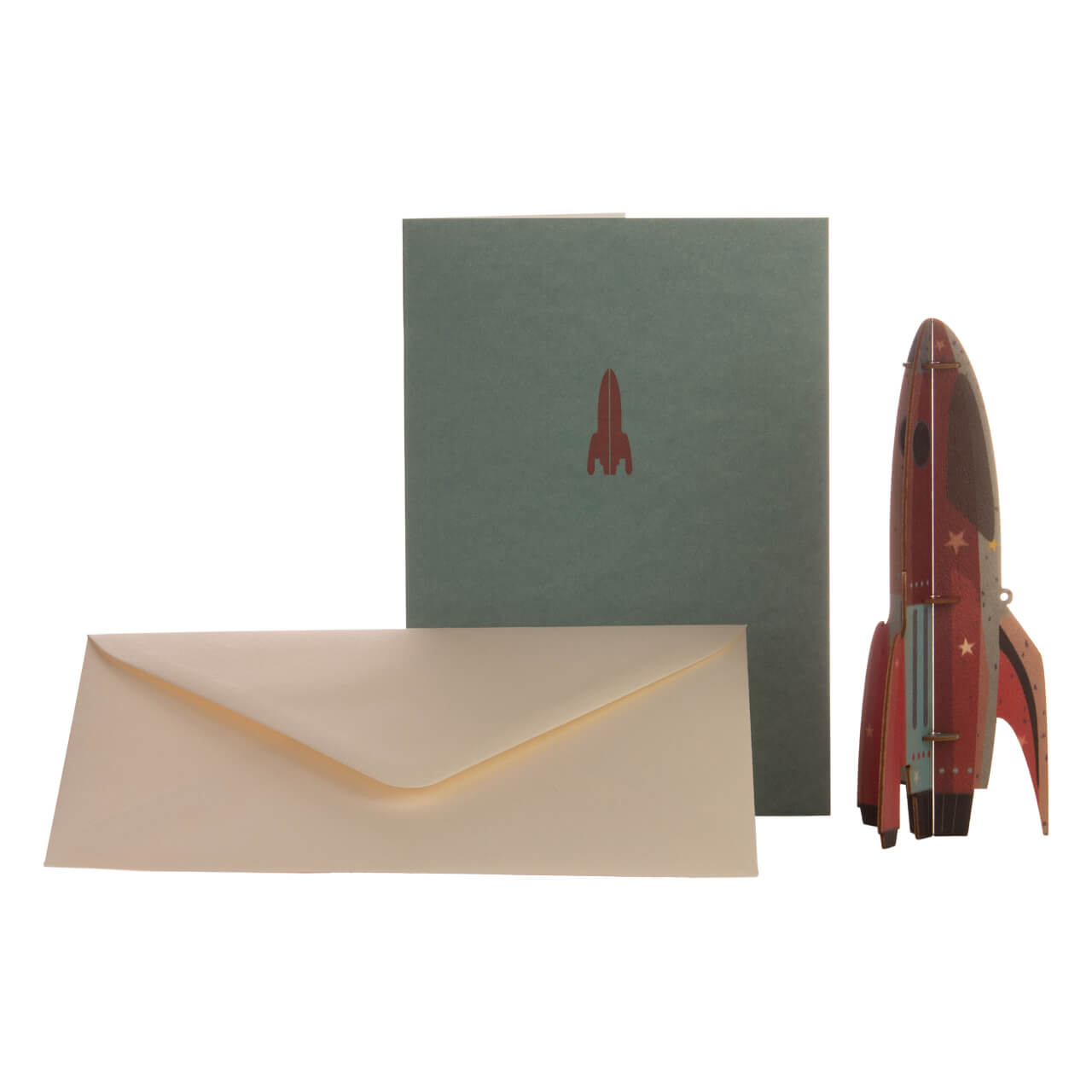 More than just words, more than just a card: anyone who opens this envelope will be wide-eyed. Because it's not just a blue A6 double card made of paper with the red silhouette of a space rocket that conveys the kind greetings of a good friendship. A thin wooden card made of 1 mm thick birch plywood and printed in colour on both sides, complete with instructions in German, English and French, also flutters out of the envelope.